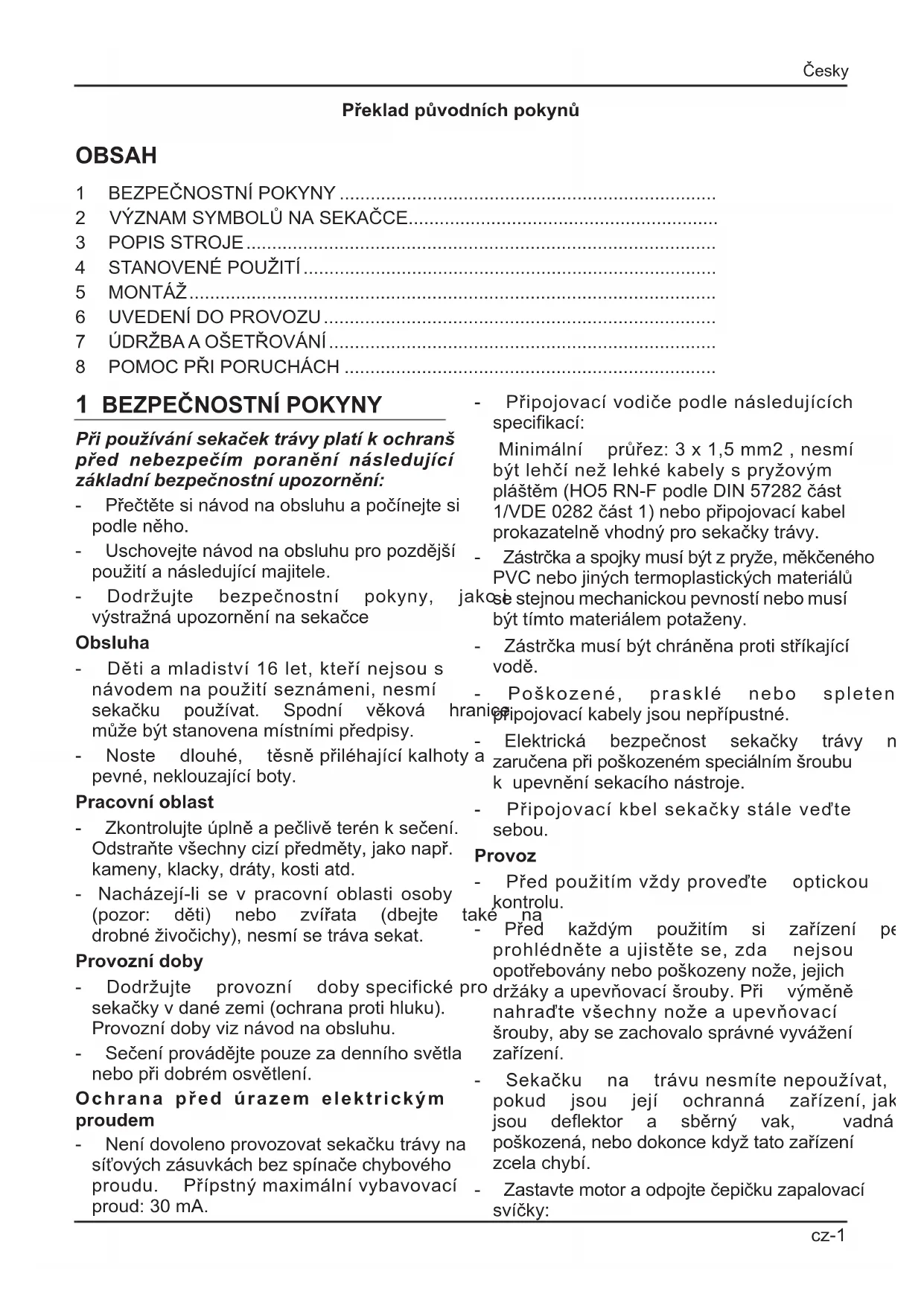 Při používání sekaček trávy platí k ochranš před nebezpečím poranění následující základní bezpečnostní upozornění: - Přečtětesinávodnaobsluhuapočínejtesi podleněho. - Uschovejtenávodnaobsluhupropozdější použitíanásledujícímajitele. - Dodržujte bezpečnostní pokyny, jakoi výstražnáupozorněnínasekačce Obsluha - Dětiamladiství16let,kteřínejsous návodemnapoužitíseznámeni,nesmí sekačku používat. Spodní věková hranice můžebýtstanovenamístnímipředpisy. - Noste dlouhé, těsněpřiléhajícíkalhotya pevné,neklouzajícíboty. Pracovní oblast - Zkontrolujteúplněapečlivěterénksečení. Odstraňtevšechnycizípředměty,jakonapř. kameny, klacky, dráty, kosti atd. - Nacházejí-li se v pracovní oblasti osoby (pozor: děti) nebo zvířata (dbejte také na drobnéživočichy),nesmísetrávasekat. Provozní doby - Dodržujte provozní dobyspecificképro sekačkyvdanézemi(ochranaprotihluku). Provozní doby viz návod na obsluhu. - Sečeníprovádějtepouzezadenníhosvětla nebopřidobrémosvětlení. Ochrana před úrazem elektrickým proudem - Nenídovolenoprovozovatsekačkutrávyna síťovýchzásuvkáchbezspínačechybového proudu. Přípstnýmaximálnívybavovací proud:30mA. - Připojovacívodičepodlenásledujících specikací: Minimální průřez:3x1,5mm2,nesmí býtlehčínežlehkékabelyspryžovým pláštěm(HO5RN-FpodleDIN57282část 1/VDE0282část1)nebopřipojovacíkabel prokazatelněvhodnýprosekačkytrávy. - Zástrčkaaspojkymusíbýtzpryže,měkčeného PVCnebojinýchtermoplastickýchmateriálů se stejnou mechanickou pevností nebo musí býttímtomateriálempotaženy. - Zástrčkamusíbýtchráněnaprotistříkající vodě. - Poškozené, prasklé nebo spletené připojovacíkabelyjsounepřípustné. - Elektrická bezpečnost sekačky trávy není zaručenapřipoškozenémspeciálnímšroubu kupevněnísekacíhonástroje. - Připojovacíkbelsekačkystáleveďte sebou. Provoz - Předpoužitímvždyproveďte optickou kontrolu. - Před každým použitím si zařízení pečlivě prohlédněteaujistětese,zda nejsou opotřeboványnebopoškozenynože,jejich držákyaupevňovacíšrouby.Při výměně nahraďtevšechnynožeaupevňovací šrouby,abysezachovalosprávnévyvážení zařízení. - Sekačku na trávunesmítenepoužívat, pokud jsou její ochranná zařízení,jako jsou deektor a sběrný vak, vadná nebo poškozená,nebodokoncekdyžtatozařízení zcela chybí. - Zastavtemotoraodpojtečepičkuzapalovací svíčky: Česky cz-1 Překlad původních pokynůDodatečný pokyn k návodu k obsluze nářadí, odstavec “Pro Vaši bezpečnost”. Nářadíneníurčenok používáníosobami (včetnědětí)somezenýmifyzickými,sen- zorickými nebo psychickými schopnostmi nebonedostatečnýmizkušenostmia/nebo znalostmi,ledažejsoupřipoužívánínářadí poddohledemnebobylypoučenyosobou, kterájezodpovědnázajejichbezpečnost. Nadětisemádohlížet,abysezajistilo,žesi snářadímnehrají. -Nežodstranítepřípadnázaseknutínebo uvolníteodváděč. -Ponárazunapřekážku. -Kdyžzačnezařízeníneobvyklýmzpůsobem vibrovat. - Všechnymatice,svorníky a šrouby musí býtřádněutaženy,abysezajistilsprávnýa bezpečnýprovozzařízení. - Častokontrolujtestavsběrnéhovaku;nesmí býtopotřebovánanipoškozen. - Poškozenéneboopotřebovanédílyokamžitě vyměňte. -Sekačku používejte pouze v technickém stavupředepsanémvýrobcem. - Uživatel sekačky je zodpovědný za úrazy najinýchosobáchnebonapoškozeníjejich vlastnictví. - Budete-lipřecházetpřesjinéplochy,nežje sečenáplocha,zastavtemotor. - Motor nespouštějte, stojíte-li před vyhazovacímkanálem (sekačka trávy s bočnímodhazováním). - Sekačkutrávypoužívejtepouzenaplochách ksečení. - Neuvádějte mimo provoz bezpečnostní, popř.ochrannázařízenísekačkytrávy. - Kespuštěnísekačkytrávymusímítsekací nástrojúplně volný chod. Event. pohony vypnětespojkou. - Musí-lisesekačkatrávykespuštění nadzvednout,másekacínástroj směřovat naodvrácenoustranuoduživatele. - Nedávejte ruce a nohy do blízkosti rotujících dílů. - Používánísekačkytrávyjedovolenopouze přidodrženíbezpečnévzdálenostiuvedené vodícímdržadlem. - Dbejtenabezpečnýpostoj. -Nikdynezvedejte anenostesekačku trávy zachodumotoru.Počkejte na zastavení sekacíhonástroje a vytáhněte síťovou zástrčku. - Sečení vždy provádějte příčně ke svahu. Nepoužívejte sekačku trávy při sečení do svahu a ze svahu a na svazích se sklonem většímnež15°. - Pozorpřizměněsměrujízdynebopřisečení pozpátku. - Sekačku trávy veďtepouzekrokovou rychlostí. Nenechávejtesekačkutrávybezdozoru. Údržba a uskladnění Předveškerýmipraceminasekačcetrávy: - Vypnětemotor,počkejte na zastavení sekacího nástrojeaodpojte připojovací kabelodsítě. - Přičinnostechv oblastinože noste vždy ochrannérukavice. - Opravysekačkytrávysmějíprovádětpouze autorizovanéodbornépodniky. Náhradní díly a příslušenství - Je nutno výhradně používat originální náhradnídílyaoriginálnípříslušenství. - Konstrukční změny a změny provedení vyhrazeny. Bezpečnostní zařízení Bezpečnostní třmen V momentě nebezpečí pusťte bezpečnostní třmen,motorasekacíústrojísezastaví. Funkce bezpečnostního třmenu nesmí být uvedená mimo provoz. Ochranná zařízení Zadní klapka (kryt proti odskakujícím kamínkům) Ochrannázařízeníchrání před poraněním vlivemčástivymrštěnýchsekacímústrojím. Sekačka trávy se nesmí provozovat bez ochrannýchzařízení. cz-2 ČeskyČesky
