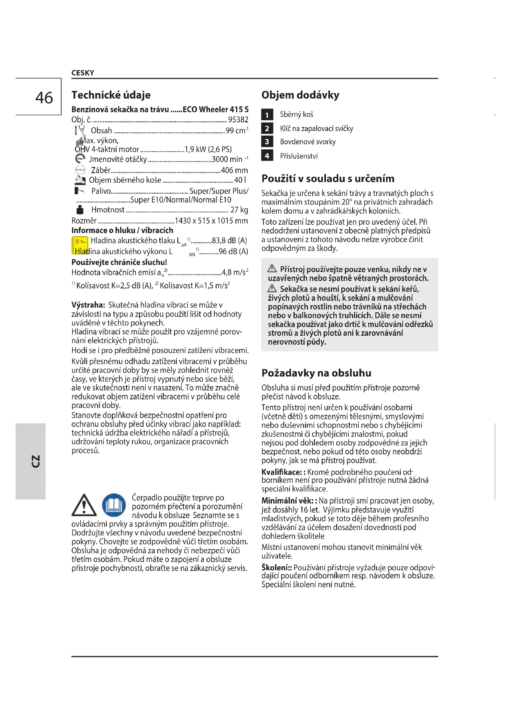 Nebezpečí exploze! Motor tankujte jen ve vypnutém stavu. Nebezpečí otravy! Přístroj používejte pouze venku, nikdy ne v uzavřených nebo špatně větraných prostorách. Zákaz kouření a otevřeného ohně. Děti a ostatní osoby i zvířata držte během používání přístroje v bezpečné vzdálenosti. Nevystavujte stroj dešti. Chraňte před vlhkem Chraňte před mrazem Noste bezpečnostní obuv s ochranou proti proříznutí, drsnou podrážkou a ocelovou špičkou! Warnung vor heißen Oberächen! Výstraha před nebezpečným elektrickým napětím Chraňte před vlhkem Obal musí směřovat nahoru Bezpečnostní pokyny Výstraha Seznamte se se všemi bezpečnostními pokyny a sice i s pokyny v přiložené brožuř.Zanedbání při dodržování varovných upozornění a pokynů mohou mít za nás- ledek úder elektrickým proudem, požár a ebo těžká poranění. Všechna varovná upozornění a pokyny do budoucna uschovejte. Děti a ostatní osoby i zvířata držte během používání přístroje v bezpečné vzdálenosti. Minimální bezpečnostní odstup činí 5 m. CESKY
