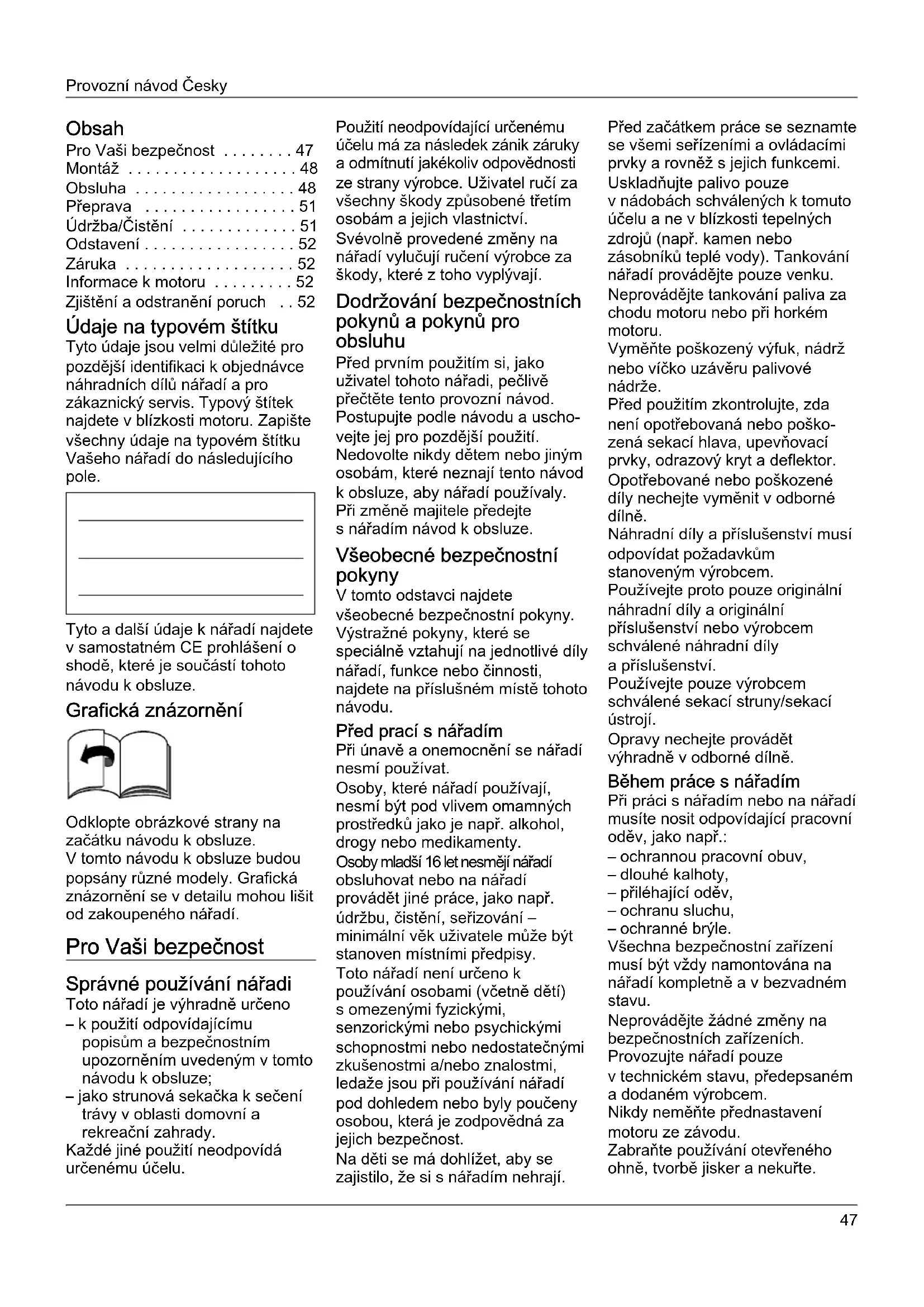 - Zjištění a odstranění poruch Údaje na typovém štítku Tyto údaje jsou velmi důležité pro pozdější identifikaci k objednávce náhradních dílů nářadí a pro zákaznický servis. Typový štítek najdete v blízkosti motoru. Zapište všechny údaje na typovém štítku Vašeho nářadí do následujícího pole. Tyto a další údaje k nářadí najdete v samostatném CE prohlášení o shodě, které je součástí tohoto návodu k obsluze. Grafická znázornění Odklopte obrázkové strany na začátku návodu k obsluze. V tomto návodu k obsluze budou popsány různé modely. Grafická znázornění se v detailu mohou lišit od zakoupeného nářadí. Pro Vaši bezpečnost Správné používání nářadi Toto nářadí je výhradně určeno – k použití odpovídajícímu popisům a bezpečnostním upozorněním uvedeným v tomto návodu k obsluze; – jako strunová sekačka k sečení trávy v oblasti domovní a rekreační zahrady. Každé jiné použití neodpovídá určenému účelu. Použití neodpovídající určenému účelu má za následek zánik záruky a odmítnutí jakékoliv odpovědnosti ze strany výrobce. Uživatel ručí za všechny škody způsobené třetím osobám a jejich vlastnictví. Svévolně provedené změny na nářadí vylučují ručení výrobce za škody, které z toho vyplývají. Dodržování bezpečnostních pokynů a pokynů pro obsluhu Před prvním použitím si, jako uživatel tohoto nářadi, pečlivě přečtěte tento provozní návod. Postupujte podle návodu a uscho- vejte jej pro pozdější použití. Nedovolte nikdy dětem nebo jiným osobám, které neznají tento návod k obsluze, aby nářadí používaly. Při změně majitele předejte s nářadím návod k obsluze. Všeobecné bezpečnostní pokyny V tomto odstavci najdete všeobecné bezpečnostní pokyny. Výstražné pokyny, které se speciálně vztahují na jednotlivé díly nářadí, funkce nebo činnosti, najdete na příslušném místě tohoto návodu. Před prací s nářadím Při únavě a onemocnění se nářadí nesmí používat. Osoby, které nářadí používají, nesmí být pod vlivem omamných prostředků jako je např. alkohol, drogy nebo medikamenty. Osoby mladší 16 let nesmějí nářadí obsluhovat nebo na nářadí provádět jiné práce, jako např. údržbu, čistění, seřizování – minimální věk uživatele může být stanoven místními předpisy. Toto nářadí není určeno k používání osobami (včetně dětí) s omezenými fyzickými, senzorickými nebo psychickými schopnostmi nebo nedostatečnými zkušenostmi a/nebo znalostmi, ledaže jsou při používání nářadí pod dohledem nebo byly poučeny osobou, která je zodpovědná za jejich bezpečnost. Na děti se má dohlížet, aby se zajistilo, že si s nářadím nehrají. Před začátkem práce se seznamte se všemi seřízeními a ovládacími prvky a rovněž s jejich funkcemi. Uskladňujte palivo pouze v nádobách schválených k tomuto účelu a ne v blízkosti tepelných zdrojů (např. kamen nebo zásobníků teplé vody). Tankování nářadí provádějte pouze venku. Neprovádějte tankování paliva za chodu motoru nebo při horkém motoru. Vyměňte poškozený výfuk, nádrž nebo víčko uzávěru palivové nádrže. Před použitím zkontrolujte, zda není opotřebovaná nebo poško- zená sekací hlava, upevňovací prvky, odrazový kryt a deflektor. Opotřebované nebo poškozené díly nechejte vyměnit v odborné dílně. Náhradní díly a příslušenství musí odpovídat požadavkům stanoveným výrobcem. Používejte proto pouze originální náhradní díly a originální příslušenství nebo výrobcem schválené náhradní díly a příslušenství. Používejte pouze výrobcem schválené sekací struny/sekací ústrojí. Opravy nechejte provádět výhradně v odborné dílně. Během práce s nářadím Při práci s nářadím nebo na nářadí musíte nosit odpovídající pracovní oděv, jako např.: – ochrannou pracovní obuv, – dlouhé kalhoty, – přiléhající oděv, – ochranu sluchu, – ochranné brýle. Všechna bezpečnostní zařízení musí být vždy namontována na nářadí kompletně a v bezvadném stavu. Neprovádějte žádné změny na bezpečnostních zařízeních. Provozujte nářadí pouze v technickém stavu, předepsaném a dodaném výrobcem. Nikdy neměňte přednastavení motoru ze závodu. Zabraňte používání otevřeného ohně, tvorbě jisker a nekuřte.Česky Provozní návod p. 52