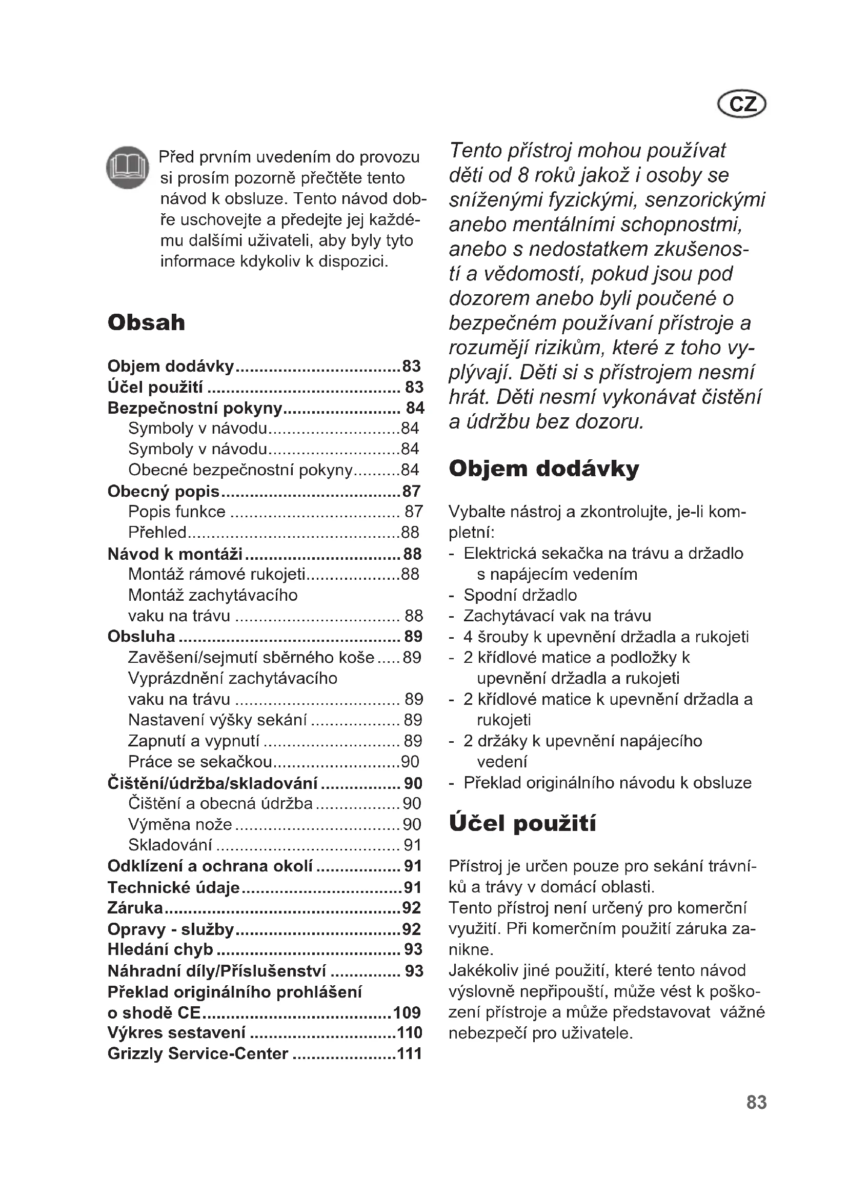 Pristroj je urcen pouze pro sekani travniku a travy v domaci oblasti.