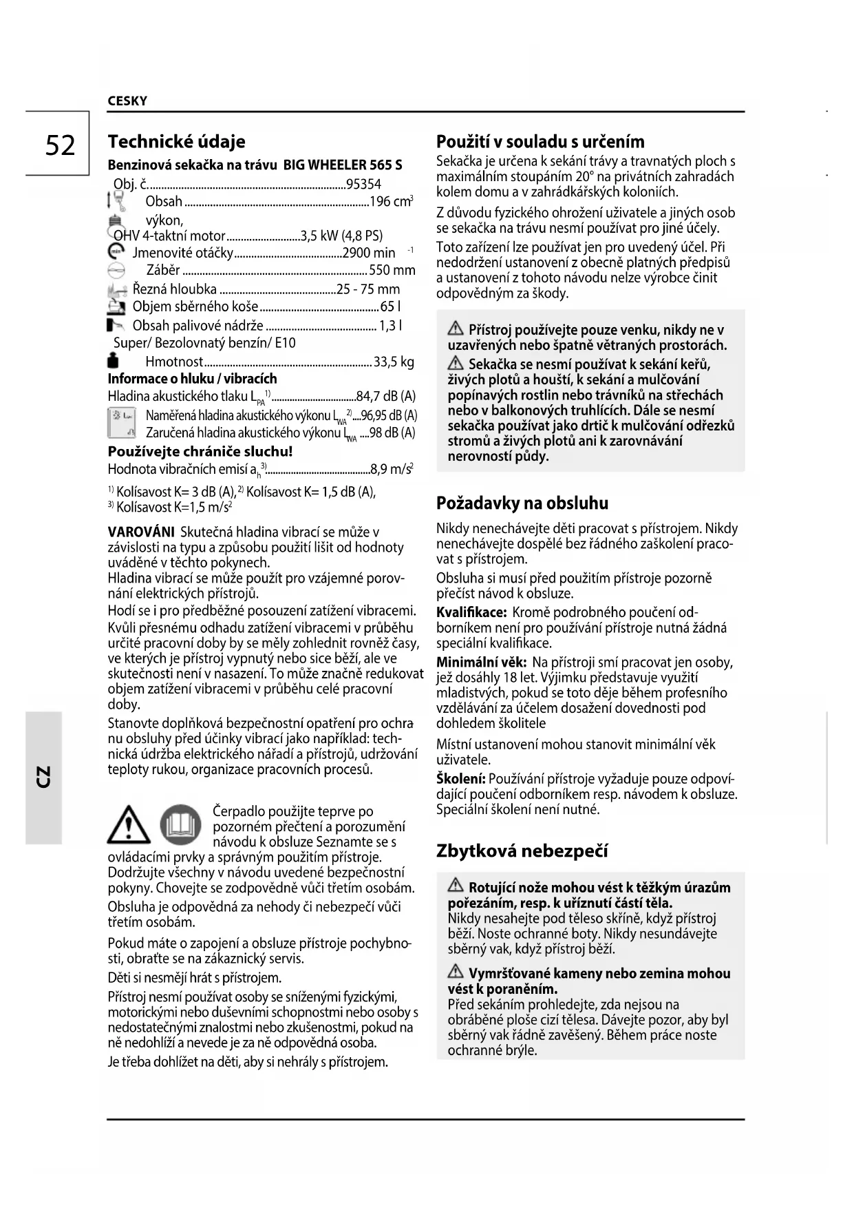 dající poučení odborníkem resp. návodem kobsluze. Speciální školení není nutné. Zbytková nebezpečí Rotující nože mohou vést ktěžkým úrazům pořezáním, resp. k uříznutí částí těla. Nikdy nesahejte pod těleso skříně, když přístroj běží. Noste ochranné boty. Nikdy nesundávejte sběrný vak, když přístroj běží. Vymršťované kameny nebo zemina mohou vést k poraněním. Před sekáním prohledejte, zda nejsou na obráběné ploše cizí tělesa. Dávejte pozor, aby byl sběrný vak řádně zavěšený. Během práce noste ochranné brýle. Technické údaje Benzinová sekačka na trávu BIG WHEELER 565 S Obj. č. .....................................................................95354 Obsah .................................................................196 cm