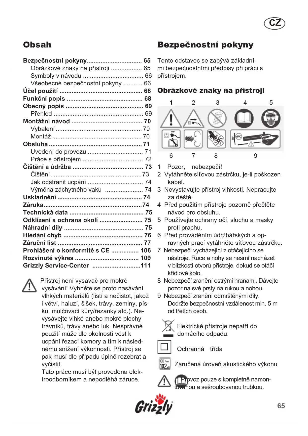 Pristroj není vysavač pro mokré vysávani! Vyhněte se proto nasávání vlhkých materialú (listí a nečistot, jakoz i větvi, haluzí, šišek, trávy, zeminy, pisku, mulčovaci kury/rezanky atd.). Nevysávejte vlhék anebo mokró plochy travnikú, trávy anebo luk. Nesprávné použití muže dle okolností věst k ucpání Ľrezaci komory a tím k následnému sníženi vykonnosti. Pristroj se pak musí dle pripadu uplně rozebrat a vycistit.