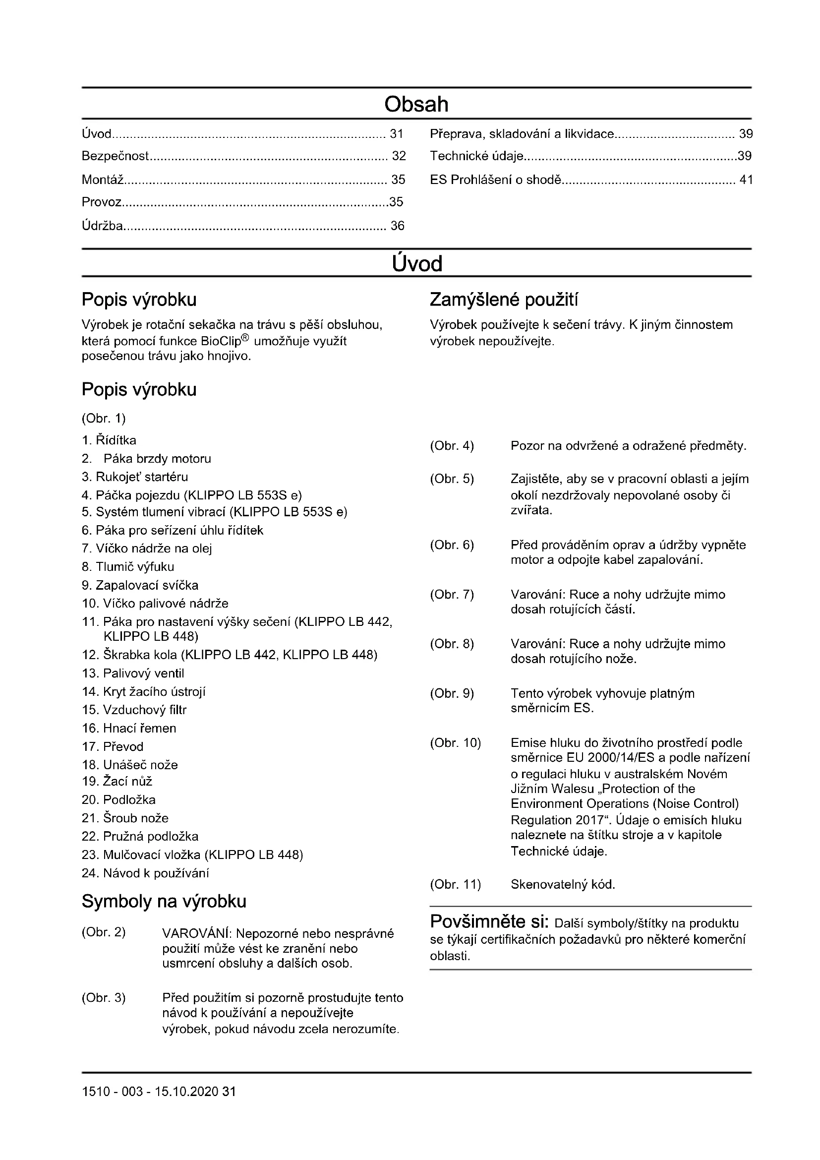 Symboly na výrobku (Obr. 2) VAROVÁNÍ: Nepozorné nebo nesprávné použití může vést ke zranění nebo usmrcení obsluhy a dalších osob. (Obr. 3) Před použitím si pozorně prostudujte tento návod k používání a nepoužívejte výrobek, pokud návodu zcela nerozumíte. (Obr. 4) Pozor na odvržené a odražené předměty. (Obr. 5) Zajistěte, aby se v pracovní oblasti a jejím okolí nezdržovaly nepovolané osoby či zvířata. (Obr. 6) Před prováděním oprav a údržby vypněte motor a odpojte kabel zapalování. (Obr. 7) Varování: Ruce a nohy udržujte mimo dosah rotujících částí. (Obr. 8) Varování: Ruce a nohy udržujte mimo dosah rotujícího nože. (Obr. 9) Tento výrobek vyhovuje platným směrnicím ES. (Obr. 10) Emise hluku do životního prostředí podle směrnice EU 2000/14/ES a podle nařízení o regulaci hluku v australském Novém Jižním Walesu „Protection of the Environment Operations (Noise Control) Regulation 2017“. Údaje o emisích hluku naleznete na štítku stroje a v kapitole Technické údaje. (Obr. 11) Skenovatelný kód. Povšimněte si: Další symboly/štítky na produktu se týkají certifikačních požadavků pro některé komerční oblasti. 1510 - 003 - 15.10.2020 31Emise Euro V VÝSTRAHA: Manipulace s motorem vede k zneplatnění typového schválení EU tohoto výrobku. Odpovědnost za výrobek Jak uvádí zákon o odpovědnosti za výrobek, neneseme odpovědnost za žádnou škodu způsobenou našim výrobkem, pokud: