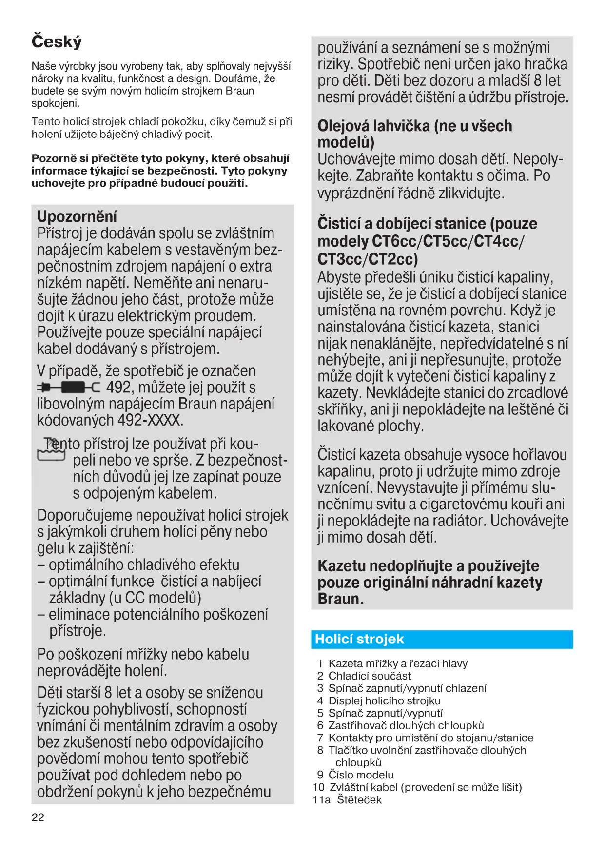 konsumpcyjny nie wyłącza, nie ogranicza ani nie zawiesza uprawnień Kupującego wynikających z przepisów o rękojmi za wady rzeczy sprzedanej. 91004880_CoolTec_CEEMEA_S6-88.indd 21 21.07.16 12:25 CSS APPROVED Effective Date 22Jul2016 GMT - Printed 27Sep2016 Page 21 of 8822 Český Naše výrobky jsou vyrobeny tak, aby splňovaly nejvyšší nároky na kvalitu, funkčnost a design. Doufáme, že budete se svým novým holicím strojkem Braun spokojeni. Tento holicí strojek chladí pokožku, díky čemuž si při holení užijete báječný chladivý pocit. Pozorně si přečtěte tyto pokyny, které obsahují informace týkající se bezpečnosti. Tyto pokyny uchovejte pro případné budoucí použití. Upozornění Přístroj je dodáván spolu se zvláštním napájecím kabelem s vestavěným bez- pečnostním zdrojem napájení o extra nízkém napětí. Neměňte ani nenaru- šujte žádnou jeho část, protože může dojít k úrazu elektrickým proudem. Používejte pouze speciální napájecí kabel dodávaný s přístrojem. V případě, že spotřebič je označen 492, můžete jej použít s libovolným napájecím Braun napájení kódovaných 492-XXXX. Tento přístroj lze používat při kou- peli nebo ve sprše. Z bezpečnost- ních důvodů jej lze zapínat pouze s odpojeným kabelem. Doporučujeme nepoužívat holicí strojek s jakýmkoli druhem holící pěny nebo gelu k zajištění: – optimálního chladivého efektu – optimální funkce čistící a nabíjecí základny (u CC modelů) – eliminace potenciálního poškození přístroje. Po poškození mřížky nebo kabelu neprovádějte holení. Děti starší 8 let a osoby se sníženou fyzickou pohyblivostí, schopností vnímání či mentálním zdravím a osoby bez zkušeností nebo odpovídajícího povědomí mohou tento spotřebič používat pod dohledem nebo po obdržení pokynů k jeho bezpečnému používání a seznámení se s možnými riziky. Spotřebič není určen jako hračka pro děti. Děti bez dozoru a mladší 8 let nesmí provádět čištění a údržbu přístroje. Olejová lahvička (ne u všech modelů) Uchovávejte mimo dosah dětí. Nepoly- kejte. Zabraňte kontaktu s očima. Po vyprázdnění řádně zlikvidujte. Čisticí a dobíjecí stanice (pouze modely CT6cc/CT5cc/CT4cc/ CT3cc/CT2cc) Abyste předešli úniku čisticí kapaliny, ujistěte se, že je čisticí a dobíjecí stanice umístěna na rovném povrchu. Když je nainstalována čisticí kazeta, stanici nijak nenaklánějte, nepředvídatelné s ní nehýbejte, ani ji nepřesunujte, protože může dojít k vytečení čisticí kapaliny z kazety. Nevkládejte stanici do zrcadlové skříňky, ani ji nepokládejte na leštěné či lakované plochy. Čisticí kazeta obsahuje vysoce hořlavou kapalinu, proto ji udržujte mimo zdroje vznícení. Nevystavujte ji přímému slu- nečnímu svitu a cigaretovému kouři ani ji nepokládejte na radiátor. Uchovávejte ji mimo dosah dětí. Kazetu nedoplňujte a používejte pouze originální náhradní kazety Braun. Holicí strojek 1 Kazeta mřížky a řezací hlavy 2 Chladicí součást 3 Spínač zapnutí/vypnutí chlazení 4 Displej holicího strojku 5 Spínač zapnutí/vypnutí 6 Zastřihovač dlouhých chloupků 7 Kontakty pro umístění do stojanu/stanice 8 Tlačítko uvolnění zastřihovače dlouhých chloupků 9 Číslo modelu 10 Zvláštní kabel (provedení se může lišit) 11a Štěteček 91004880_CoolTec_CEEMEA_S6-88.indd 22 21.07.16 12:25 CSS APPROVED Effective Date 22Jul2016 GMT - Printed 27Sep2016 Page 22 of 8823 11b Pouzdro* 11c Ochranný kryt* 12a Nabíjecí stojan 12b Napájecí zásuvka stojanu 12c Držak nabijeciho stojanu* 12d Kontakty pro nabíjení ve stojanu
