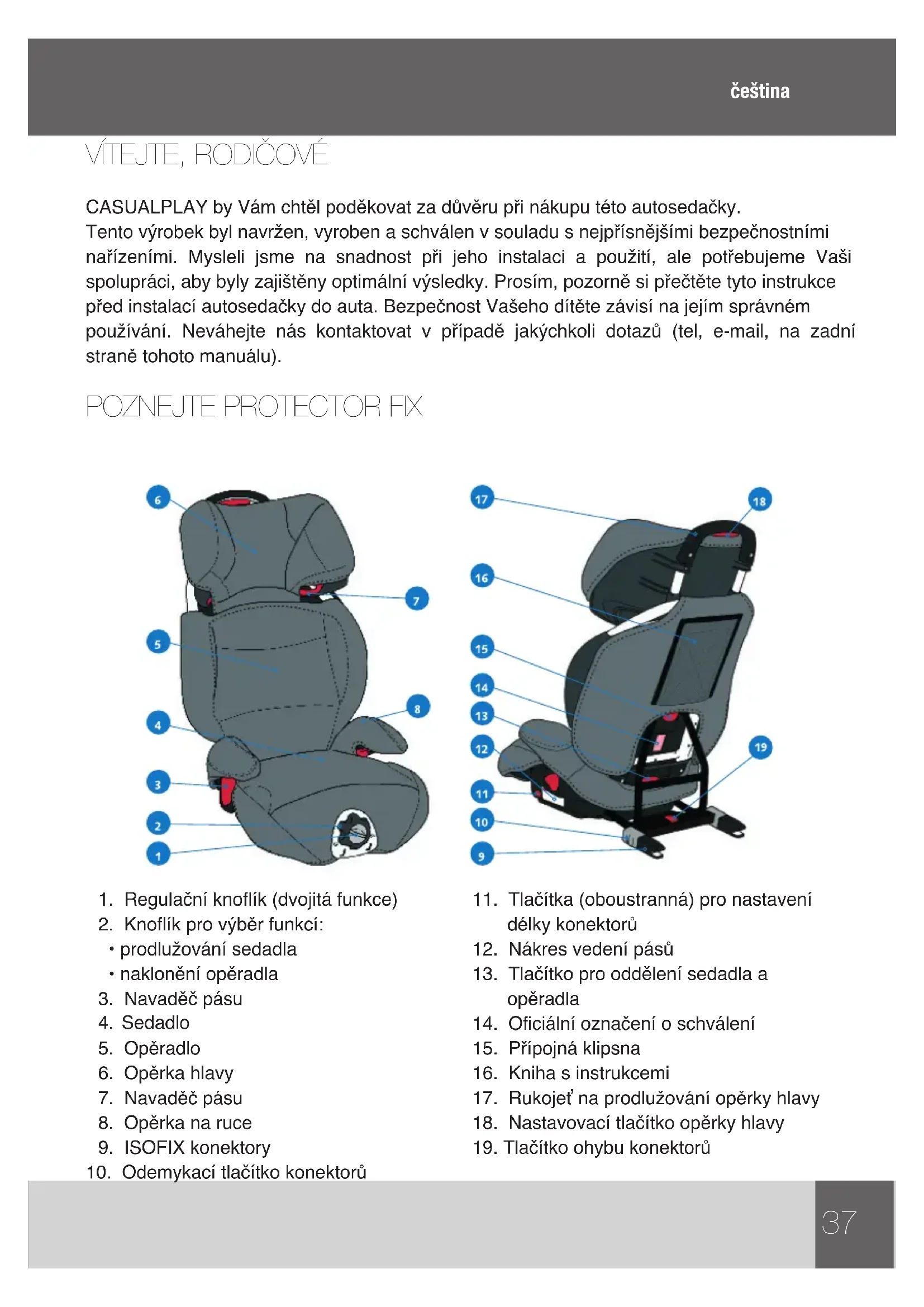 CASUALPLAY by Vám chtěl poděkovat za důvěru při nákupu této autosedačky. Tento výrobek byl navržen, vyroben a schválen v souladu s nejpřísnějšími bezpečnostními nařízeními. Mysleli jsme na snadnost při jeho instalaci a použití, ale potřebujeme Vaši spolupráci, aby byly zajištěny optimální výsledky. Prosím, pozorně si přečtěte tyto instrukce před instalací autosedačky do auta. Bezpečnost Vašeho dítěte závisí na jejím správném používání. Neváhejte nás kontaktovat v případě jakýchkoli dotazů (tel, e-mail, na zadní straně tohoto manuálu).