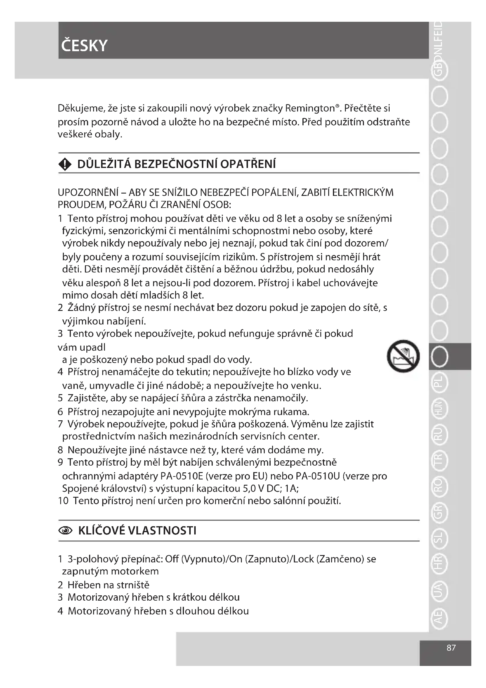 - Tento prístroj bude fungovat s privodni šnúrou pouze tehdy, když bude do site pripojen prés dodany sitový adapter Remington, jiné USB nabiječky prístroj pouze nabíji.