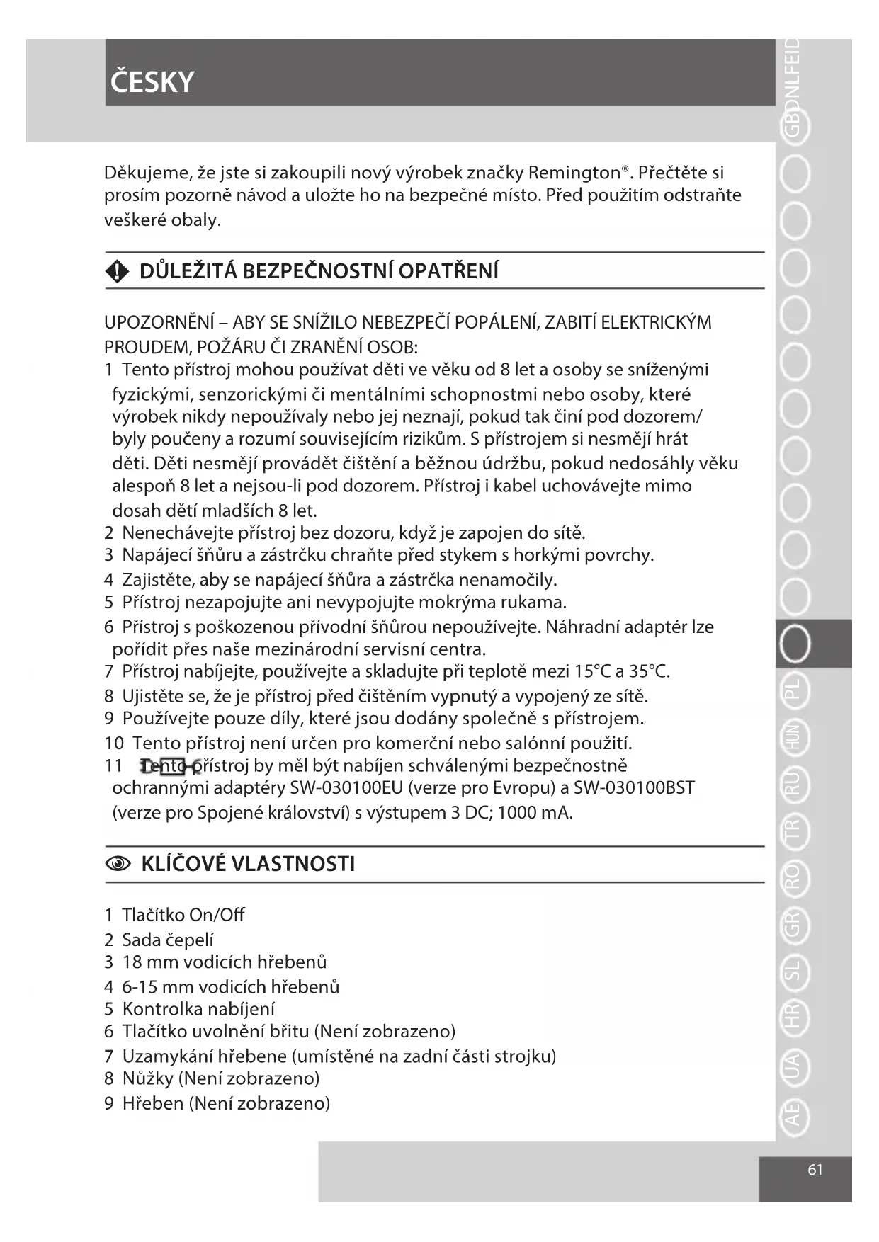 Dekujeme, ze jste si zakoupili novy vyrobek značky Remington. Přečte si prosim pozorně námod a uložte ho na bezpečné mistro. Préd použitím odstrante veškeré obaly.