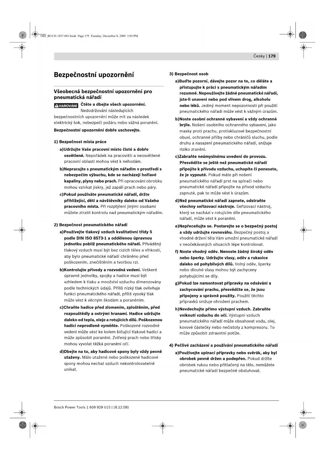 a)Používejte upínací přípravky nebo svěrák, aby byl obrobek pevně držen a podepřen. Pokud držíte obrobek rukou nebo přitlačený na tělo, nemůžete pneumatické nářadí bezpečně obsluhovat. VAROVÁNÍ OBJ_BUCH-1037-001.book Page 179 Tuesday, December 8, 2009 1:03 PM1 609 929 U15 | (8.12.09) Bosch Power Tools 180 | Česky b)Pneumatické nářadí nepřetěžujte. Pro Vaši práci použijte k tomu určené pneumatické nářadí. S vhodným pneumatickým nářadím pracujete v uvedeném rozsahu výkonu lépe a bezpečněji. c)Nepoužívejte žádné pneumatické nářadí, jehož spínač je vadný. Pneumatické nářadí, které již nelze zapnout nebo vypnout, je nebezpečné a musí být opraveno. d)Přerušte přívod vzduchu předtím, než provedete seřízení stroje, výměnu dílů příslušenství nebo pneumatické nářadí odložíte. Tato preventivní opatření zabrání neúmyslnému startu pneumatického nářadí. e)Nepoužívané pneumatické stroje ukládejte mimo dosah dětí. Nenechávejte používat pneumatické nářadí osoby, které tento stroj neznají nebo nečetly tyto pokyny. Pneumatické nářadí je nebez- pečné, pokud je používáno nezkušenými osobami. f) Svědomitě pečujte o pneumatické nářadí. Kontrolujte, zda pohyblivé díly stroje bezvadně fungují a nesvírají se a nejsou-li díly zlomené nebo tak poškozené, že je snížena funkce pneumatického nářadí. Poškozené díly nechte před nasazením pneumatického nářadí opravit. Mnoho nehod má příčinu ve špatně udržovaném pneumatickém nářadí. g)Používejte pneumatické nářadí, příslušenství, nasazovací nástroje apod. podle těchto pokynů. Respektujte přitom pracovní podmínky a prováděnou činnost. Použití pneumatického nářadí pro jiná než určená použití může vést k nebezpečným situacím.