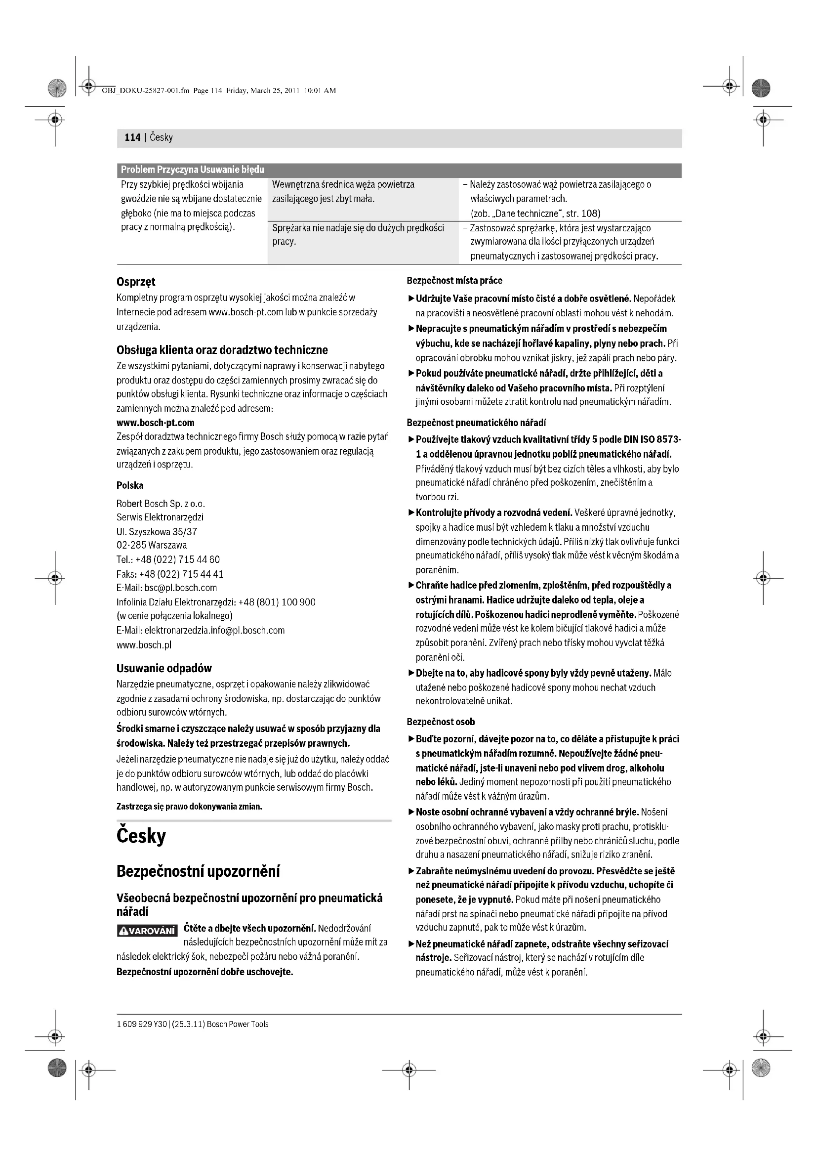 Professional Dr. Egbert Schneider Senior Vice President Engineering Dr. Eckerhard Strötgen Head of Product Certification OBJ_DOKU-25827-001.fm Page 117 Friday, March 25, 2011 10:01 AM1 609 929 Y30 | (25.3.11) Bosch Power Tools 118 | Česky teprve poté, když se stiskne spoušť 10. Vzhledem k tomu mohou být další procesy zatloukání spuštěny jen tehdy, pokud byly spoušť a inicializační pojistka napřed uvedeny do výchozího stavu. – Kontaktní inicializace U tohoto systému inicializace se musí nejprve stlačit spoušť 10. Zatloukaný předmět je vystřelen vždy poté, když se při stlačené spoušti inicializační pojistka 2 posadí pevně na obrobek. Tím se dosáhne vyšší rychlosti práce. Pro nastavení systému inicializace slouží přepínač 9. Uvedení do provozu Přerušte zásobování vzduchem dříve, než přistoupíte k seřízení stroje, výměně dílů příslušenství nebo pneumatické nářadí odložíte. Toto preventivní opatření zabrání neúmyslnému startu pneumatického nářadí. Práce s jednotlivou inicializací (viz obr. C) – Stlačte přepínač 9 dovnitř a současně jej překlopte do spodní polohy, až opět zaskočí. Inicializační systém „Jednotlivá inicializace“ je nastaven. – Přepínač 9 zase uvolněte. – Posaďte ústí 11 nebo popř. pogumovaný chránič obrobku 1 pevně na obrobek, až je inicializační pojistka 2 zcela stlačena. – Následně krátce stiskněte spoušť 10 a zase ji uvolněte. Tím se vystřelí hřebík. – Nechte pneumatické nářadí odrazit se. – Pro další proces zatloukání zvedněte pneumatické nářadí zcela z obrobku a pevně jej opět posaďte na další požadované místo. Práce s kontaktní inicializací (viz obr. D) – Stlačte přepínač 9 dovnitř a současně jej překlopte do vrchní polohy, až opět zaskočí. Inicializační systém „Kontaktní inicializace“ je nastaven. – Přepínač 9 zase uvolněte. – Stiskněte spoušť 10 a podržte ji stlačenou. – Posaďte ústí 11 nebo popř. pogumovaný chránič obrobku 1 pevně na obrobek, až je inicializační pojistka 2 zcela stlačena. Tím se vystřelí hřebík. – Nechte pneumatické nářadí odrazit se. – Pro další proces zatloukání zvedněte pneumatické nářadí zcela z obrobku a pevně jej opět posaďte na další požadované místo. – Pohybujte pneumatickým nářadím zvednutím a opět posazením rovnoměrně přes obrobek. Pokaždé, když pneumatické nářadí posadíte a je stlačena inicializační pojistka, vystřelí se jeden hřebík. – Jakmile byl zatlučen požadovaný počet hřebíků, spoušť 10 opět uvolněte. Pracovní pokyny Přerušte zásobování vzduchem dříve, než přistoupíte k seřízení stroje, výměně dílů příslušenství nebo pneumatické nářadí odložíte. Toto preventivní opatření zabrání neúmyslnému startu pneumatického nářadí. Před každým začátkem práce zkontrolujte bezvadnou funkci bezpečnostních a inicializačních zařízení a též pevné usazení všech šroubů a matic. Vadné nebo poruchově pracující pneumatické nářadí ihned odpojte od přívodu vzduchu a kontaktujte autorizovaný servis Bosch. Neprovádějte na pneumatickém nářadí žádné nepředepsané manipulace. Nedemontujte ani nezablokujte žádné díly pneumatického nářadí, jako např. inicializační pojistku. Neprovádějte žádné „nouzové opravy“ pomocí nevhodných prostředků. U pneumatického nářadí je třeba provádět pravidelnou a náležitou údržbu (viz „Údržba a čištění“, strana 119). Zabraňte jakémukoli zeslabení a poškození pneumatického nářadí, např. v důsledku: – zatloukání nebo vyrytí, – od výrobce nepovolenými přestavbovými zásahy, – vedení na šablonách, jež jsou vyrobeny z tvrdého materiálu, např. oceli, – upuštění na podlahu nebo posouvání po podlaze, – zacházení jako s kladivem, – jakéhokoli druhu násilného působení. Přesvědčete se, co se nachází pod nebo za Vaším obrobkem. Nestřílejte žádné hřebíky do stěn, stropů nebo podlah, když se za nimi nacházejí osoby. Hřebíky mohou obrobek prorazit a někoho zranit. Nestřílejte žádný hřebík na již zatlučený hřebík. Hřebík se při tom může zdeformovat, hřebíky se mohou vzpříčit nebo pneumatické nářadí se může nekontrolovaně pohybovat. Bude-li pneumatické nářadí nasazeno při chladných okolních podmínkách, budou první hřebíky zatlučeny pomaleji než obvykle. Poté, co se pneumatické nářadí během práce ohřeje, je opět možná normální rychlost práce. Pro zmenšení opotřebení úderníku se vyvarujte prázdných výstřelů. Při delších pracovních přestávkách nebo na konci práce odpojte pneumatické nářadí od přívodu vzduchu a pokud možno vyprázdněte zásobník. Vyprázdnění zásobníku – Zatáhněte posuvník zásobníku 7 tak daleko nazpět až vzadu zaskočí. – Vyjměte pásky s hřebíky 14. Zahoďte ty pásky s hřebíky, které obsahují méně než 5 hřebíků. – Zatáhněte posuvník zásobníku 7 ještě jednou zcela zpátky, aby se uvolnila aretace. – Veďte posuvník zásobníku opatrně dopředu až se dotkne začátku zásobníku. Upozornění: Nenechte posuvník zásobníku neřízeně se vymrštit zpět. Posuvník zásobníku by se přitom mohl poškodit a je nebezpečí, že se přiskřípnou Vaše prsty. Nastavení hloubkového dora zu (viz obr. E) Hloubku zatlučení hřebíků lze nastavit pomocí nastavovacího kolečka 3. – Vyprázdněte zásobník 8. (viz „Vyprázdnění zásobníku“, strana 118) – Hřebíky jsou vstřeleny příliš hluboko: Pro zmenšení hloubky zatlučení otočte nastavovací kolečko 3 ve směru hodinových ručiček. nebo Hřebíky nejsou vstřeleny dost hluboko: Pro zvětšení hloubky zatlučení otočte nastavovací kolečko 3 proti 