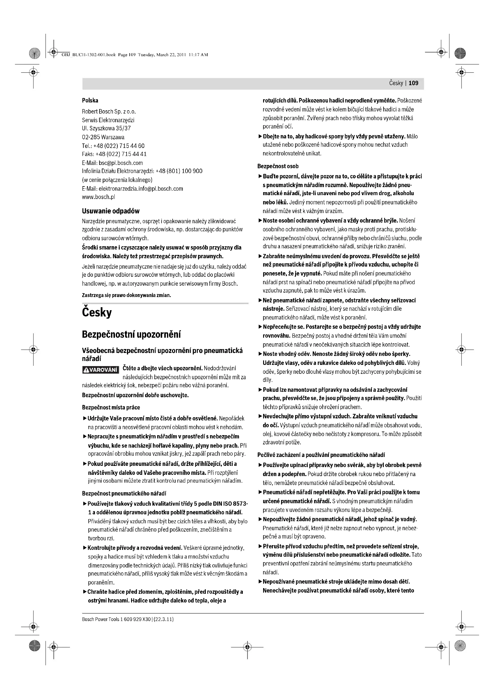 Upozornění: Posuvník zásobníku se musí nechat bez velkého vynaložení síly (jen silou prstu) odsunout nazpět. Ztuha jdoucí posuvník zásobníku způsobí, že hřebíky budou nastřelovány v nesprávném úhlu. – Veďte posuvník zásobníku 11 se stlačeným unašečem hřebíků 18 opatrně vpřed až se unašeč hřebíků nasune nad poslední hřebík a tím posuňte pásek s hřebíky v zásobníku zcela dopředu. Upozornění: Nenechte posuvník zásobníku neřízeně se vymrštit zpět. Posuvník zásobníku by se přitom mohl poškodit a je nebezpečí, že se přiskřípnou Vaše prsty. Provoz Systémy inicializace Pneumatické nářadí lze provozovat se dvěma rozdílnými systémy inicializace: – Jednotlivá inicializace s bezpečnostním sledem U tohoto systému inicializace se musí nejprve pevně posadit na obrobek inicializační pojistka 2. Zatloukaný předmět je vystřelen teprve poté, když se stiskne spoušť 5. Vzhledem k tomu mohou být další procesy zatloukání spuštěny jen tehdy, pokud byly spoušť a inicializační pojistka napřed uvedeny do výchozího stavu. – Kontaktní inicializace U tohoto systému inicializace se musí nejprve stlačit spoušť 5. Zatloukaný předmět je vystřelen vždy poté, když se při stlačené spoušti inicializační pojistka 2 posadí pevně na obrobek. Tím se dosáhne vyšší rychlosti práce. Pro nastavení systému inicializace slouží přepínač 6. Uvedení do provozu Přerušte zásobování vzduchem dříve, než přistoupíte k seřízení stroje, výměně dílů příslušenství nebo pneumatické nářadí odložíte. Toto preventivní opatření zabrání neúmyslnému startu pneumatického nářadí. Práce s jednotlivou inicializací (viz obr. C) – Stlačte přepínač 6 dovnitř a současně jej překlopte do spodní polohy, až opět zaskočí. Inicializační systém „Jednotlivá inicializace“ je nastaven. – Posaďte ústí 13 nebo popř. pogumovaný chránič obrobku 1 pevně na obrobek, až je inicializační pojistka 2 zcela stlačena. – Následně krátce stiskněte spoušť 5 a zase ji uvolněte. Tím se vystřelí hřebík. – Nechte pneumatické nářadí odrazit se. – Pro další proces zatloukání zvedněte pneumatické nářadí zcela z obrobku a pevně jej opět posaďte na další požadované místo. Práce s kontaktní inicializací (viz obr. D) – Stlačte přepínač 6 dovnitř a současně jej překlopte do vrchní polohy, až opět zaskočí. Inicializační systém „Kontaktní inicializace“ je nastaven. – Stiskněte spoušť 5 a podržte ji stlačenou. – Posaďte ústí 13 nebo popř. pogumovaný chránič obrobku 1 pevně na obrobek, až je inicializační pojistka 2 zcela stlačena. Tím se vystřelí hřebík. – Nechte pneumatické nářadí odrazit se. – Pro další proces zatloukání zvedněte pneumatické nářadí zcela z obrobku a pevně jej opět posaďte na další požadované místo. – Pohybujte pneumatickým nářadím zvednutím a opět posazením rovnoměrně přes obrobek. Pokaždé, když pneumatické nářadí posadíte a je stlačena inicializační pojistka, vystřelí se jeden hřebík. – Jakmile byl zatlučen požadovaný počet hřebíků, spoušť 5 opět uvolněte. Pracovní pokyny Přerušte zásobování vzduchem dříve, než přistoupíte k seřízení stroje, výměně dílů příslušenství nebo pneumatické nářadí odložíte. Toto preventivní opatření zabrání neúmyslnému startu pneumatického nářadí. Před každým začátkem práce zkontrolujte bezvadnou funkci bezpečnostních a inicializačních zařízení a též pevné usazení všech šroubů a matic. Vadné nebo poruchově pracující pneumatické nářadí ihned odpojte od přívodu vzduchu a kontaktujte autorizovaný servis Bosch. Neprovádějte na pneumatickém nářadí žádné nepředepsané manipulace. Nedemontujte ani nezablokujte žádné díly pneumatického nářadí, jako např. inicializační pojistku. Neprovádějte žádné „nouzové opravy“ pomocí nevhodných prostředků. U pneumatického nářadí je třeba provádět pravidelnou a náležitou údržbu (viz „Údržba a čištění“, strana 113). Zabraňte jakémukoli zeslabení a poškození pneumatického nářadí, např. v důsledku: – zatloukání nebo vyrytí, – od výrobce nepovolenými přestavbovými zásahy, – vedení na šablonách, jež jsou vyrobeny z tvrdého materiálu, např. oceli, – upuštění na podlahu nebo posouvání po podlaze, – zacházení jako s kladivem, – jakéhokoli druhu násilného působení. Přesvědčete se, co se nachází pod nebo za Vaším obrobkem. Nestřílejte žádné hřebíky do stěn, stropů nebo podlah, když se za nimi nacházejí osoby. Hřebíky mohou obrobek prorazit a někoho zranit. Nestřílejte žádný hřebík na již zatlučený hřebík. Hřebík se při tom může zdeformovat, hřebíky se mohou vzpříčit nebo pneumatické nářadí se může nekontrolovaně pohybovat. Bude-li pneumatické nářadí nasazeno při chladných okolních podmínkách, budou první hřebíky zatlučeny pomaleji než obvykle. Poté, co se pneumatické nářadí během práce ohřeje, je opět možná normální rychlost práce. OBJ_BUCH-1302-001.book Page 112 Tuesday, March 22, 2011 11:17 AMČesky | 113 Bosch Power Tools 1 609 929 X30 | (22.3.11) Pro zmenšení opotřebení úderníku se vyvarujte prázdných výstřelů. Při delších pracovních přestávkách nebo na konci práce odpojte pneumatické nářadí od přívodu vzduchu a pokud možno vyprázdněte zásobník. Vyprázdnění zásobníku (viz obr. E1 –E2) – Zatáhněte posuvník zásobníku 11 se stlačeným unašečem hřebíků 18 dozadu až unašeč hřebíků uvolní poslední hřebík a poté veďte posuvník zásobníku opatrně dopředu až na začátek zásobníku 10. Upozornění: Nenechte posuvník zásobníku neřízen