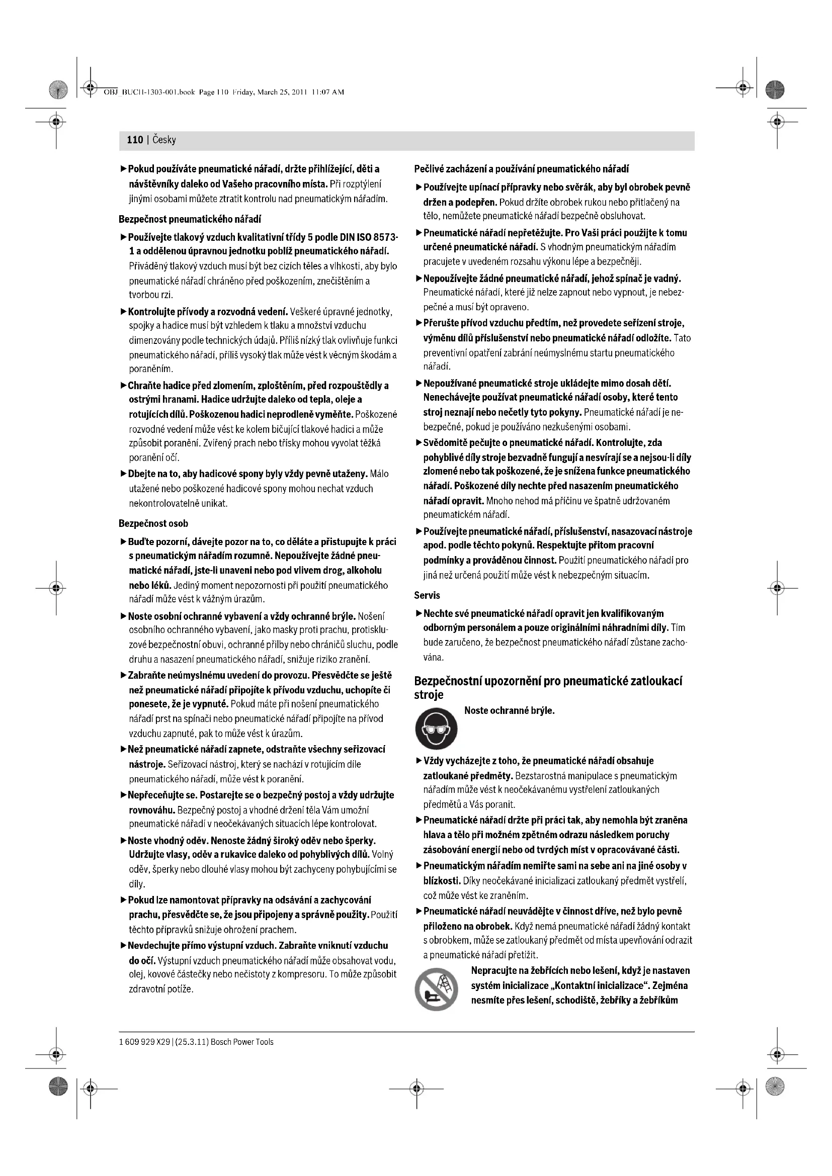 Prohlášení o shodě Prohlašujeme ve výhradní zodpovědnosti, že v odstavci „Technická data“ popsaný výrobek je v souladu s následujícími normami nebo normativními dokumenty: EN 792 podle ustanovení směrnic 2006/42/ES. Technická dokumentace u: Robert Bosch GmbH, PT/ESC, D-70745 Leinfelden-Echterdingen Robert Bosch GmbH, Power Tools Division D-70745 Leinfelden-Echterdingen Leinfelden, 25.03.2011 Montáž Připojení na zdroj vzduchu Přesvědčete se, že tlak instalace tlakového vzduchu není větší než maximální přípustný jmenovitý tlak pneumatického nářadí. Nejdříve nastavte tlak vzduchu na spodní hodnotu doporučeného jmenovitého tlaku (viz „Technická data“). Ve sporných případech zkontrolujte tlak na vstupu vzduchu pomocí manometru při zapnutém pneumatickém nářadí. Pro maximální výkon musejí být dodrženy hodnoty pro přívodní hadici 13 (připojovací závit, maximální provozní tlak, světlost hadice, maximální délka hadice; viz „Technická data“). Přiváděný tlakový vzduch musí být bez cizích těles a vlhkosti, aby bylo pneumatické nářadí chráněno před poškozením, znečištěním a tvorbou rzi. Veškeré armatury, spojovací vedení a hadice musejí být dimenzovány podle tlaku a potřebného množství vzduchu. Zabraňte zúžení přívodních vedení, např. smáčknutím, zlomením nebo cloumáním! Připojení zdroje vzduchu na pneumatické nářadí (viz obr. A) – Vyprázdněte zásobník 6. (viz „Vyprázdnění zásobníku“, strana 113) Když se v důsledku oprav a údržby nebo přepravy nenacházejí vnitřní díly pneumatického nářadí ve výchozí poloze, může při následujících pracovních krocích zatloukaný předmět vystřelit. – Spojte přípojku vzduchu 3 s přívodní hadicí 13, která je vybavena uzavírací rychlospojkou 12. – Bezvadnou funkci zkontrolujte tím, že pneumatické nářadí posadíte ústím 9 na kousek zbytkového dřeva nebo na dřevěný materiál a jednou až dvakrát inicializujete. Výměna spouště (viz obr. B1–B2) Přerušte zásobování vzduchem dříve, než přistoupíte k seřízení stroje, výměně dílů příslušenství nebo pneumatické nářadí odložíte. Toto preventivní opatření zabrání neúmyslnému startu pneumatického nářadí. Pneumatické nářadí lze provozovat se dvěma různými systémy inicializace. Systém inicializace zvolíte namontováním patřičné spouště. Vymontování spouště – Stáhněte gumový kroužek 14 z pojistného kolíku 15. – Vytáhněte pojistný kolík 15 z tělesa. – Vytáhněte spoušť směrem dozadu dolů z tělesa. Zamontování spouště – Vyberte pro požadovaný systém inicializace příslušnou spoušť. Upozornění: Dbejte při zamontování šedé spouště 5 na to, aby inicializační páčka 16 byla ve správné poloze (viz obrázek B2). – Zasuňte spoušť do tělesa. Zajistěte, aby inicializační pružina 17 obklopovala inicializační čep 18 a tlačila na inicializační páčku 16. – Vyrovnejte montážní otvory spouště s montážními otvory tělesa a skrz otvory prostrčte pojistný kolík 15. – Nasuňte gumový kroužek 14 do drážky pojistného kolíku 15. Osazení zásobníku (viz obrázky C1–C3) Přerušte zásobování vzduchem dříve, než přistoupíte k seřízení stroje, výměně dílů příslušenství nebo pneumatické nářadí odložíte. Toto preventivní opatření zabrání neúmyslnému startu pneumatického nářadí. fPoužívejte pouze originální příslušenství Bosch (viz „Technická data“). Přesné díly pneumatického nářadí jako zásobník, ústí a vystřelovací kanál jsou sladěny se sponkami, hřebíky a kolíky od firmy Bosch. Jiní výrobci používají ocel jiných kvalit a rozměrů. Použití nepřípustných zatloukaných předmětů může poškodit pneumatické nářadí a zapříčinit zranění. Držte pneumatické nářadí během osazování zásobníku tak, aby ústí 9 nesměřovalo ani na Vaše vlastní tělo ani na jiné osoby. – Podle potřeby vyčistěte a namažte vystřelovací kanál 21 a zajistěte, aby zásobník 6 nebyl znečištěný. – Zatlačte na uzávěr zásobníku 4 a otevřete víko zásobníku 7. Vřeteno zásobníku 19 se musí nastavit na délku hřebíků, aby mohly být hřebíky hladce odvíjeny dopředu do ústí. Rozměry – Výška – Šířka – Délka
