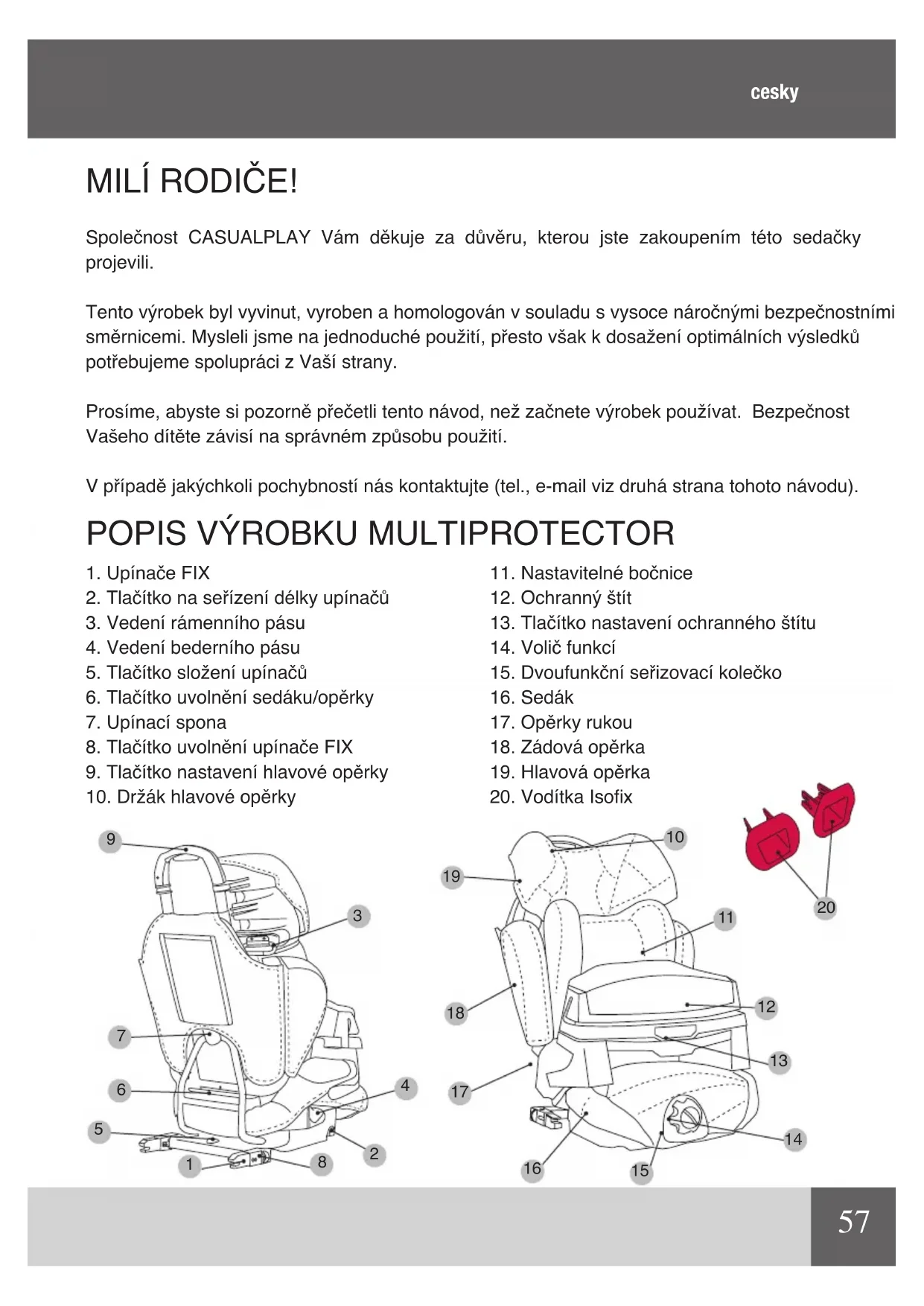 MILÍ RODIČE! Společnost CASUALPLAY Vám děkuje za důvěru, kterou jste zakoupením této sedačky projevili. Tento výrobek byl vyvinut, vyroben a homologován v souladu s vysoce náročnými bezpečnostními směrnicemi. Mysleli jsme na jednoduché použití, přesto však k dosažení optimálních výsledků potřebujeme spolupráci z Vaší strany. Prosíme, abyste si pozorně přečetli tento návod, než začnete výrobek používat. Bezpečnost Vašeho dítěte závisí na správném způsobu použití. V případě jakýchkoli pochybností nás kontaktujte (tel., e-mail viz druhá strana tohoto návodu).