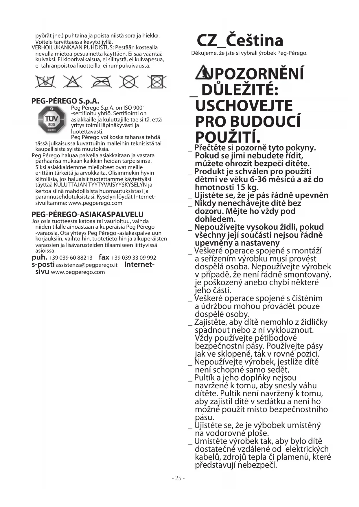 TUOTTEEN HUOLTO: Suojaa tuote sateelta, lumelta ja vedeltä. Jatkuva altistuminen auringonvalolle saattaa muuttaa monien materiaalien väriä. Säilytä tuote kuivassa paikassa. RUNGON PUHDISTUS: Puhdista muoviosat säännöllisesti kostealla kankaalla. Älä käytä liuotteita tai muita vastaavia tuotteita. Pidä tuotteen metalliosat kuivina, jotta ne eivät ruostu. Pidä kaikki liikkuvat osat (säätömekanismit, kiinnitysmekanismit,- 25 - pyörät jne.) puhtaina ja poista niistä sora ja hiekka. Voitele tarvittaessa kevytöljyllä. VERHOILUKANKAAN PUHDISTUS: Pestään kostealla rievulla mietoa pesuainetta käyttäen. Ei saa vääntää kuivaksi. Ei kloorivalkaisua, ei silitystä, ei kuivapesua, ei tahranpoistoa liuotteilla, ei rumpukuivausta. PEG-PÉREGO S.p.A. Peg Pérego S.p.A. on ISO 9001 -sertifioitu yhtiö. Sertifiointi on asiakkaille ja kuluttajille tae siitä, että yritys toimii läpinäkyvästi ja luotettavasti.Peg Pérego voi koska tahansa tehdä tässä julkaisussa kuvattuihin malleihin teknisistä tai kaupallisista syistä muutoksia. Peg Pérego haluaa palvella asiakkaitaan ja vastata parhaansa mukaan kaikkiin heidän tarpeisiinsa. Siksi asiakkaidemme mielipiteet ovat meille erittäin tärkeitä ja arvokkaita. Olisimmekin hyvin kiitollisia, jos haluaisit tuotettamme käytettyäsi täyttää KULUTTAJAN TYYTYVÄISYYSKYSELYN ja kertoa siinä mahdollisista huomautuksistasi ja parannusehdotuksistasi. Kyselyn löydät Internet-sivuiltamme: www.pegperego.com PEG-PÉREGO-ASIAKASPALVELU Jos osia tuotteesta katoaa tai vaurioituu, vaihda niiden tilalle ainoastaan alkuperäisiä Peg Pérego -varaosia. Ota yhteys Peg Pérego -asiakaspalveluun korjauksiin, vaihtoihin, tuotetietoihin ja alkuperäisten varaosien ja lisävarusteiden tilaamiseen liittyvissä asioissa. puh. +39 039 60 88213 fax +39 039 33 09 992 s-posti assistenza@pegperego.it Internet- sivu www.pegperego.com CZ_Čeština Děkujeme, že jste si vybrali ýrobek Peg-Pérego. UPOZORNĚNÍ _ DŮLEŽITÉ: USCHOVEJTE PRO BUDOUCÍ POUŽITÍ. _ Přečtěte si pozorně tyto pokyny. Pokud se jimi nebudete řídit, můžete ohrozit bezpečí dítěte. _ Produkt je schválen pro použití dětmi ve věku 6-36 měsíců a až do hmotnosti 15 kg. _ Ujistěte se, že je pás řádně upevněn _ Nikdy nenechávejte dítě bez dozoru. Mějte ho vždy pod dohledem. _ Nepoužívejte vysokou židli, pokud všechny její součásti nejsou řádně upevněny a nastaveny _ Veškeré operace spojené s montáží a seřízením výrobku musí provést dospělá osoba. Nepoužívejte výrobek v případě, že není řádně smontovaný, je poškozený anebo chybí některé jeho části. _ Veškeré operace spojené s čištěním a údržbou mohou provádět pouze dospělé osoby. _ Zajistěte, aby dítě nemohlo z židličky spadnout nebo z ní vyklouznout. Vždy používejte pětibodové bezpečnostní pásy. Používejte pásy jak ve sklopené, tak v rovné pozici. _ Nepoužívejte výrobek, jestliže dítě není schopné samo sedět. _ Pultík a jeho doplňky nejsou navržené k tomu, aby snesly váhu dítěte. Pultík není navržený k tomu, aby zajistil dítě v sedátku a není ho možné použít místo bezpečnostního pásu. _ Ujistěte se, že je výbobek umístěný na vodorovné ploše. _ Umístěte výrobek tak, aby bylo dítě dostatečné vzdálené od elektrických kabelů, zdrojů tepla či plamenů, které představují nebezpečí.- 26 - _ Nevsunujte prsty do mechanismů výrobku a při seřizování výrobku buďte velmi opatrní na končetiny dítěte. _ Použití doplňků, které nejsou schválené výrobcem, může být nebezpečné. _ Nepoužívejte výrobek v blízkosti schodů. _ Neumísťujte výrobek do blízkosti zdrojů tepla či ohně (plynový sporák, elektrická kamna atd.)