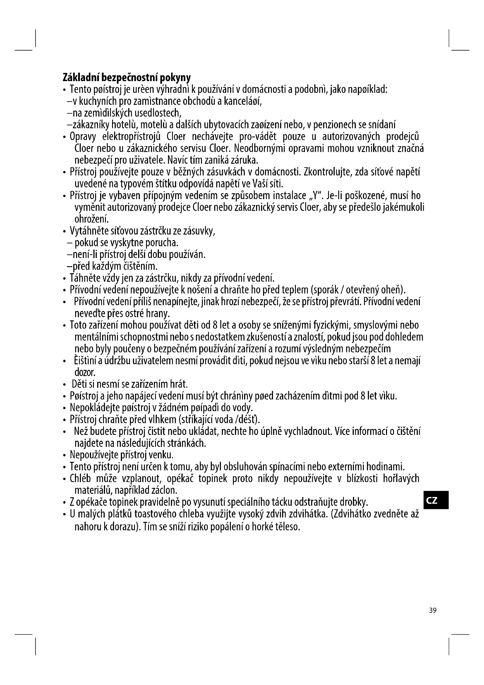 - Opravy elektropristrojú Cloer nechávejte pro-vadět pouze u autorizovanych prodejcu Cloer nebo u zákaznického servisu Cloer. Neobbornými opravami mohou vzniknout značné nebezpećí pro uživatele. Navic tim zaníka záruka.