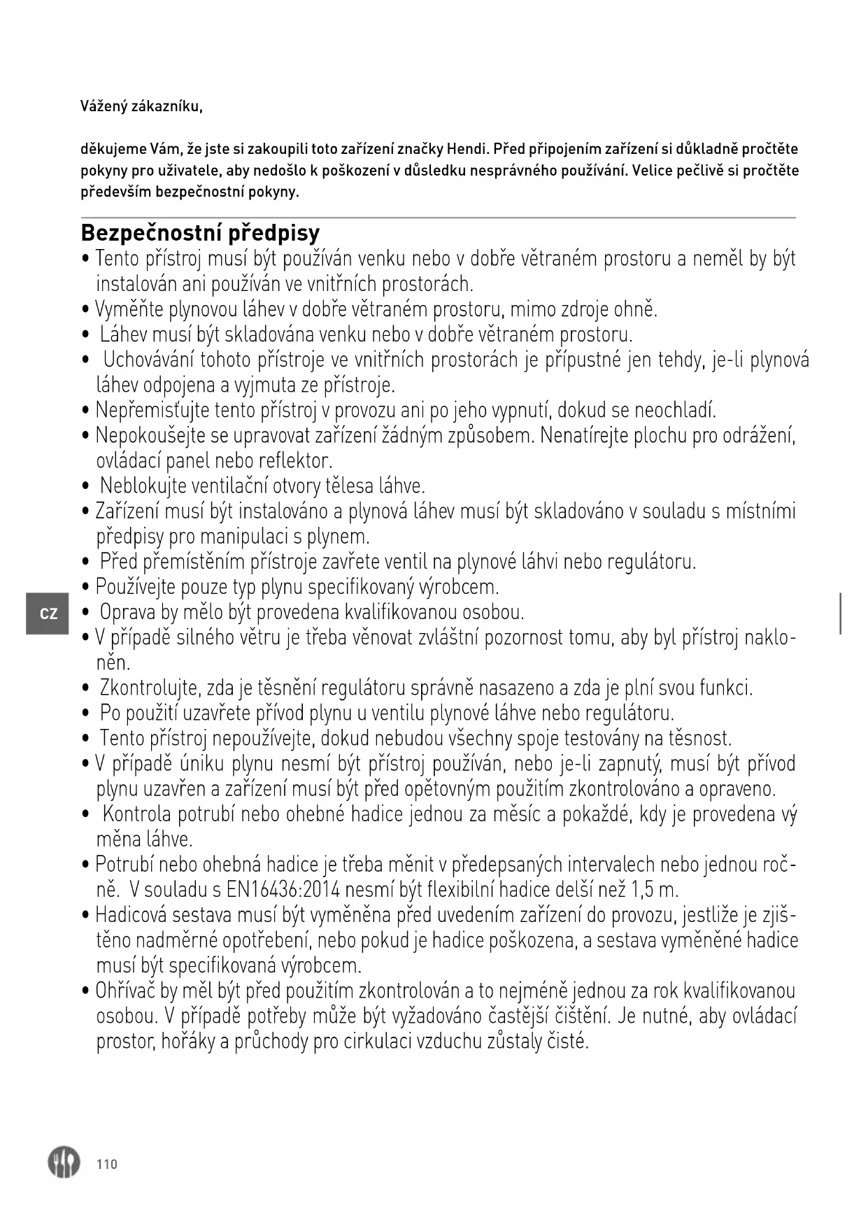 Vážený zákazníku, děkujeme Vám, že jste si zakoupili toto zařízení značky Hendi. Před připojením zařízení si důkladně pročtěte pokyny pro uživatele, aby nedošlo k poškození v důsledku nesprávného používání. Velice pečlivě si pročtěte především bezpečnostní pokyny. Bezpečnostní předpisy