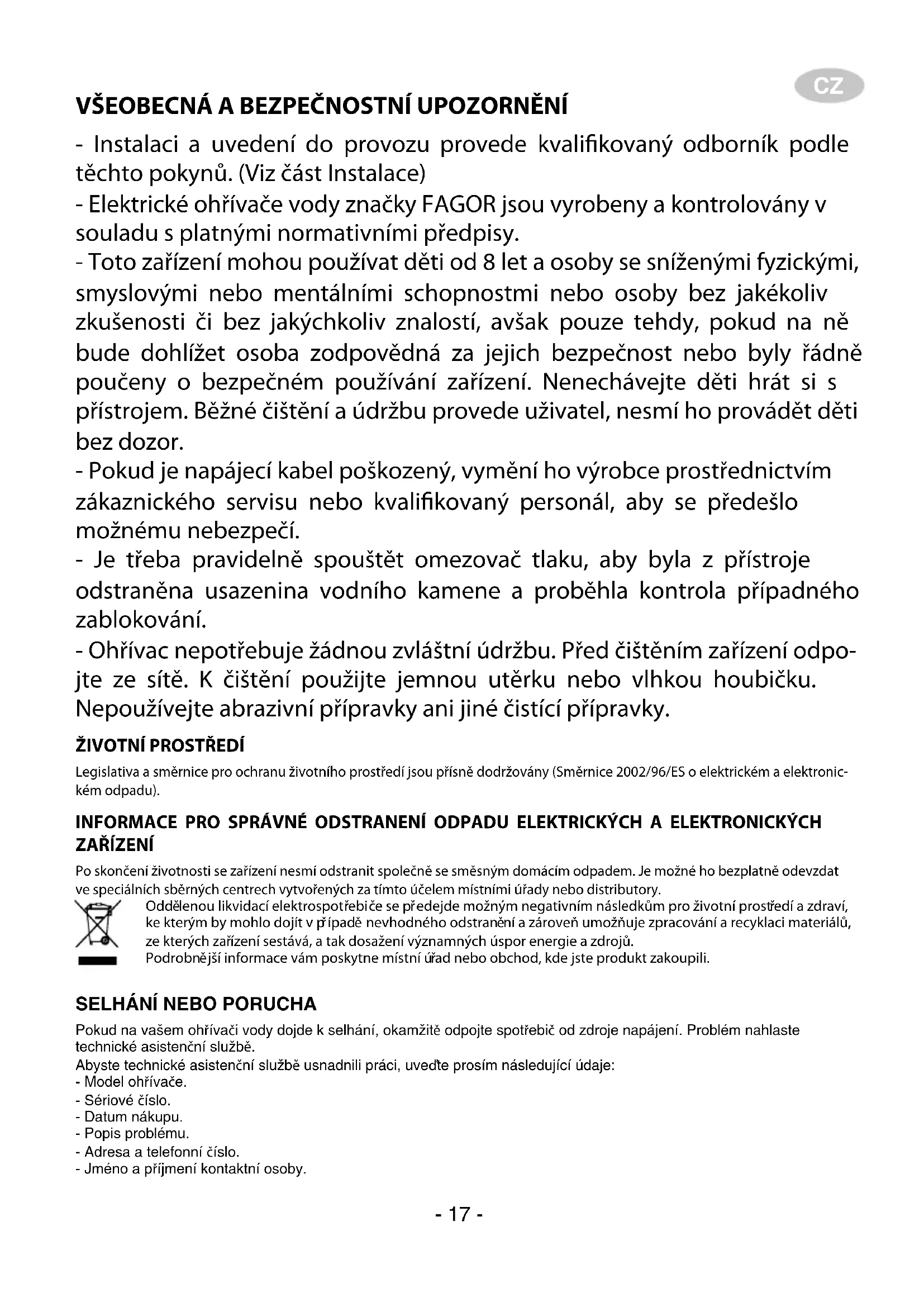 2.25 mLa chaudière doit être installée en dehors de la ZONE INTERDITE pour empêcher l’eau de s’infiltrer dans l’appareil. Si la chaudière ne possède pas de prise, elle doit être alimentée à travers un interrup-teur bipolaire doté d’ouvertures de contact d’au moins 3 mm. L’installation doit être protégée par des fusibles d’un calibre adapté au courant absorbé. Vous devez inclure une mise à la terre dans chaque installation. Pour effectuer ce branchement, la prise de la chaudière est fournie avec le contact approprié, ce qui assure la correspondance entre la base de la prise et celle fournie avec l’appareil.En cas d’absence de régulation concernant la mise à la «TERRE», nous recommandons l’installation d’un interrupteur différentiel de ≤30 mA.Cet appareil est conforme aux normes concernant les perturba-tion Radioélectriques et interférences. NOTE: La manipulation et le remplacement des pièces par toute personne ou service autre que le service d’assistance technique sont strictement interdits. Fig. 3 - 16 -CZ VŠEOBECNÁ A BEZPEČNOSTNÍ UPOZORNĚNÍ - Instalaci a uvedení do provozu provede kvalikovaný odborník podle těchto pokynů. (Viz část Instalace) - Elektrické ohřívače vody značky FAGOR jsou vyrobeny a kontrolovány v souladu s platnými normativními předpisy. - Toto zařízení mohou používat děti od 8 let a osoby se sníženými fyzickými, smyslovými nebo mentálními schopnostmi nebo osoby bez jakékoliv zkušenosti či bez jakýchkoliv znalostí, avšak pouze tehdy, pokud na ně bude dohlížet osoba zodpovědná za jejich bezpečnost nebo byly řádně poučeny o bezpečném používání zařízení. Nenechávejte děti hrát si s přístrojem. Běžné čištění a údržbu provede uživatel, nesmí ho provádět děti bez dozor. - Pokud je napájecí kabel poškozený, vymění ho výrobce prostřednictvím zákaznického servisu nebo kvalikovaný personál, aby se předešlo možnému nebezpečí. - Je třeba pravidelně spouštět omezovač tlaku, aby byla z přístroje odstraněna usazenina vodního kamene a proběhla kontrola případného zablokování. - Ohřívac nepotřebuje žádnou zvláštní údržbu. Před čištěním zařízení odpo- jte ze sítě. K čištění použijte jemnou utěrku nebo vlhkou houbičku. Nepoužívejte abrazivní přípravky ani jiné čistící přípravky.