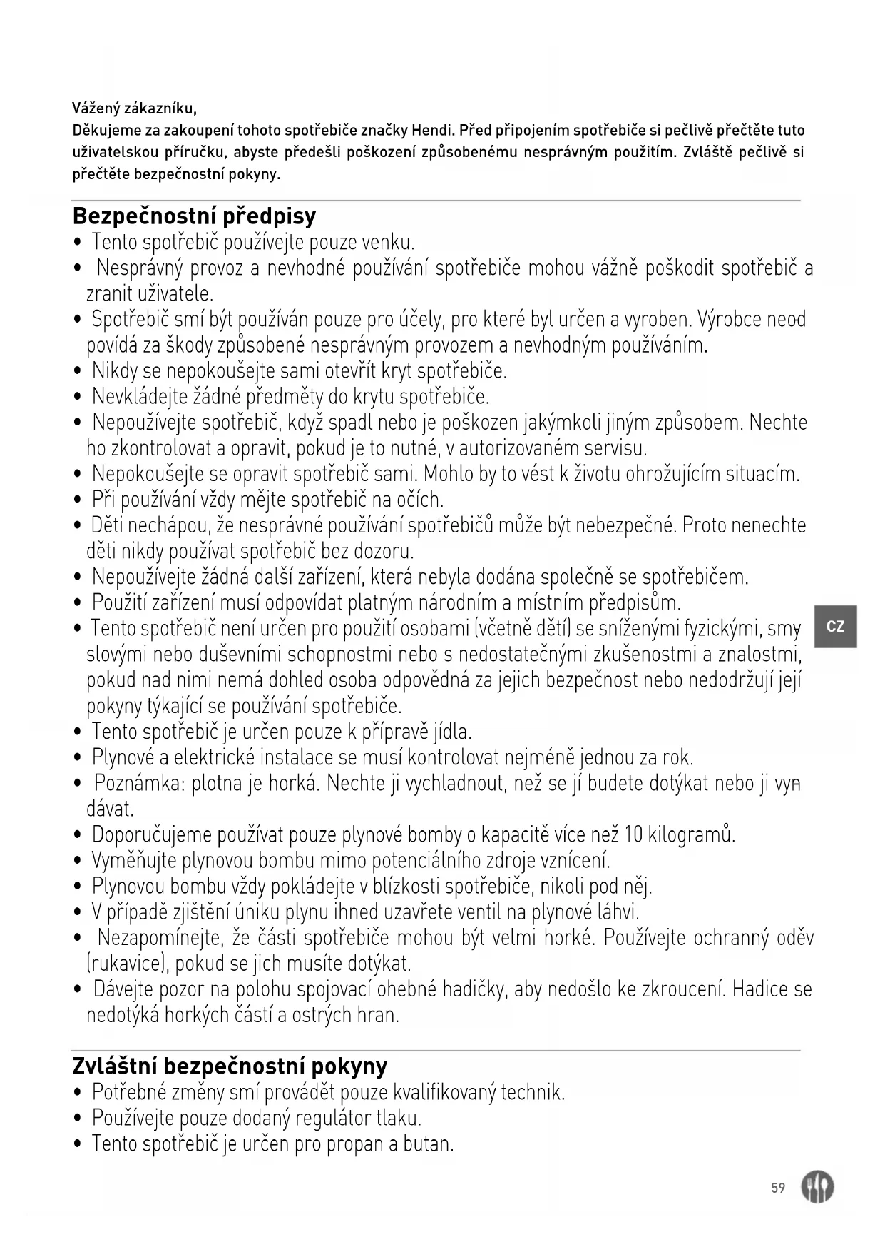 Vážený zákazníku, Děkujeme za zakoupení tohoto spotřebiče značky Hendi. Před připojením spotřebiče si pečlivě přečtěte tuto uživatelskou příručku, abyste předešli poškození způsobenému nesprávným použitím. Zvláště pečlivě si přečtěte bezpečnostní pokyny. Bezpečnostní předpisy