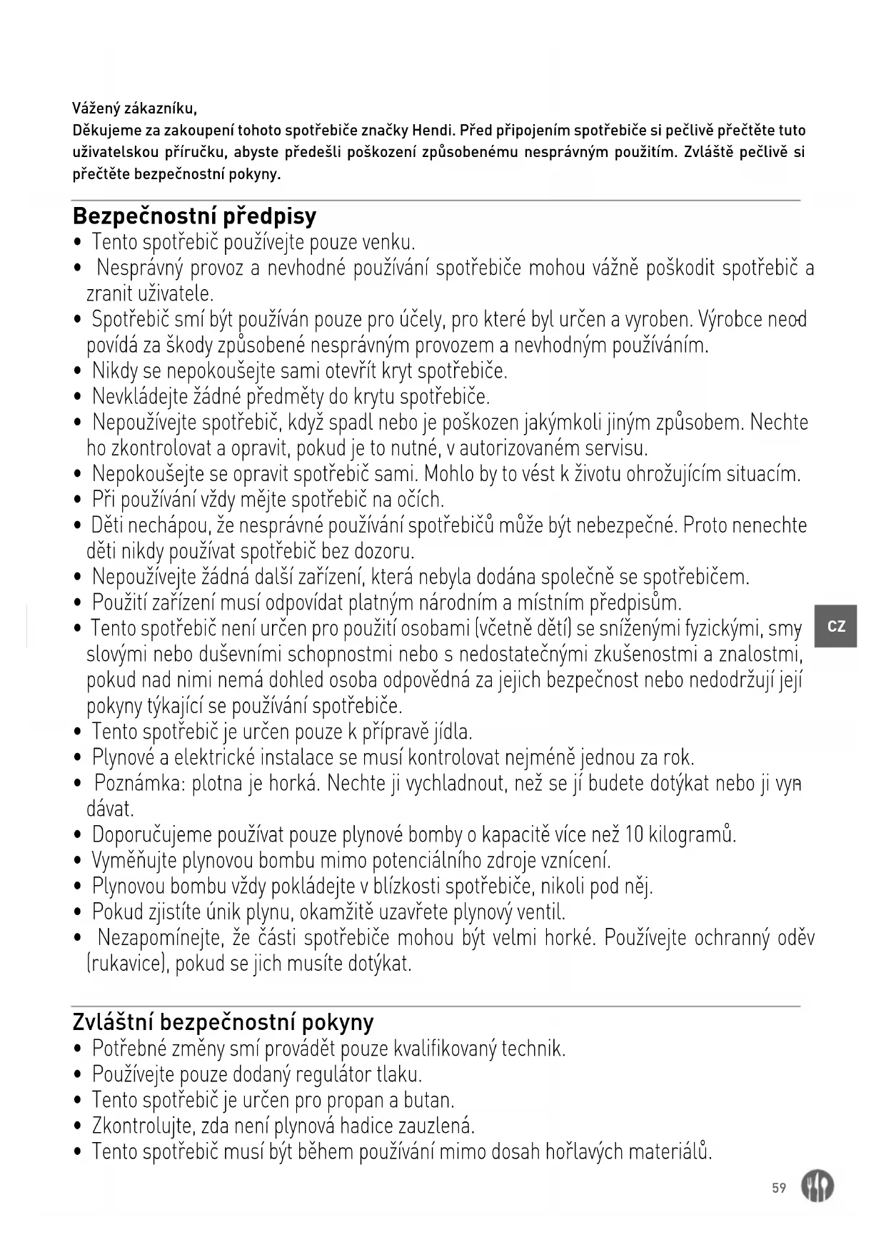 Vážený zákazníku, Děkujeme za zakoupení tohoto spotřebiče značky Hendi. Před připojením spotřebiče si pečlivě přečtěte tuto uživatelskou příručku, abyste předešli poškození způsobenému nesprávným použitím. Zvláště pečlivě si přečtěte bezpečnostní pokyny. Bezpečnostní předpisy