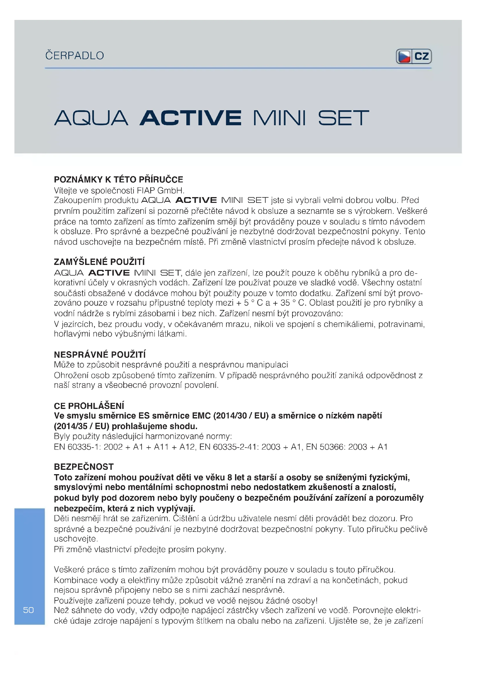 Zakoupením produktu AQUA ACTIVE MINI SET jste si vybrali velmi dobrou volbu. Před prvním použitím zařízení si pozorně přečtěte návod k obsluze a seznamte se s výrobkem. Veškeré práce na tomto zařízení as tímto zařízením smějí být prováděny pouze v souladu s tímto návodem k obsluze. Pro správné a bezpečné používání je nezbytné dodržovat bezpečnostní pokyny. Tento návod uschovejte na bezpečném místě. Při změně vlastnictví prosím předejte návod k obsluze.