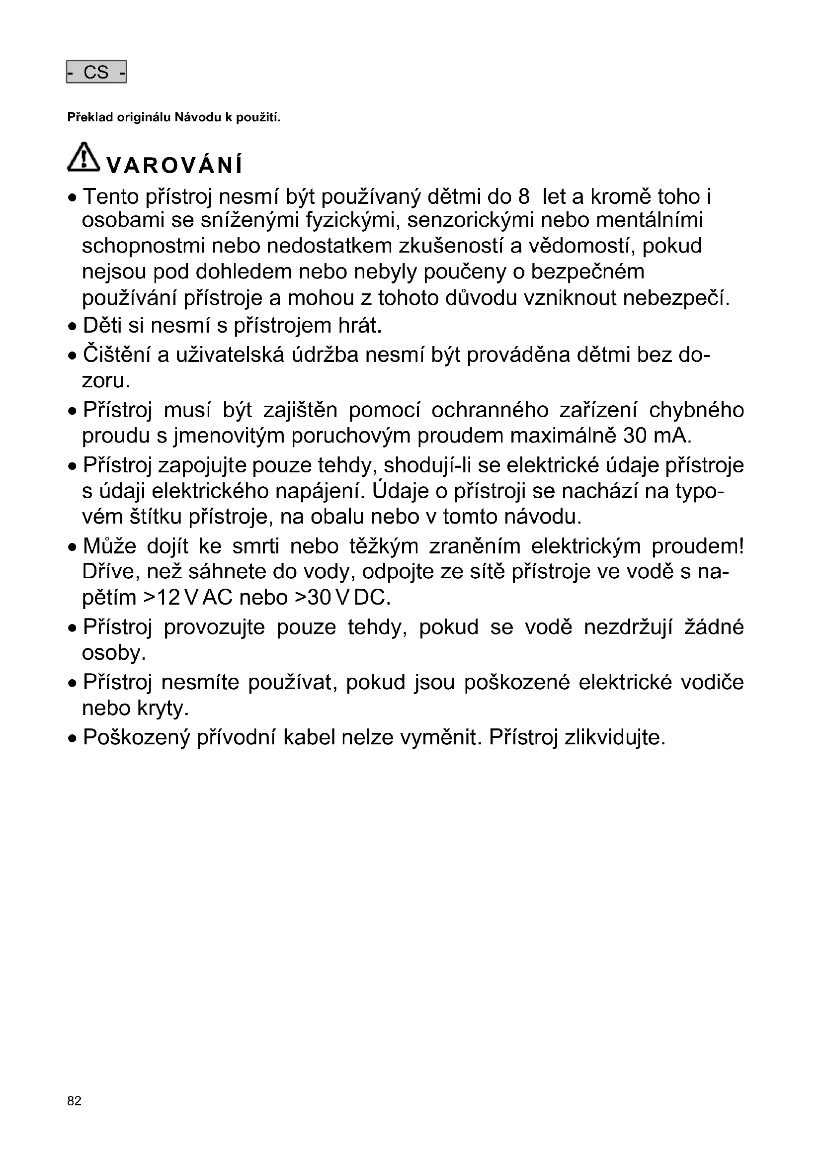 - Může dojít ke smrti nebo těžkým zraněním elektrickým proudem! Dříve, než sáhnete do vody, odpojte ze sítě přístroje ve vodě s na- pětím >12 V AC nebo >30 V DC.