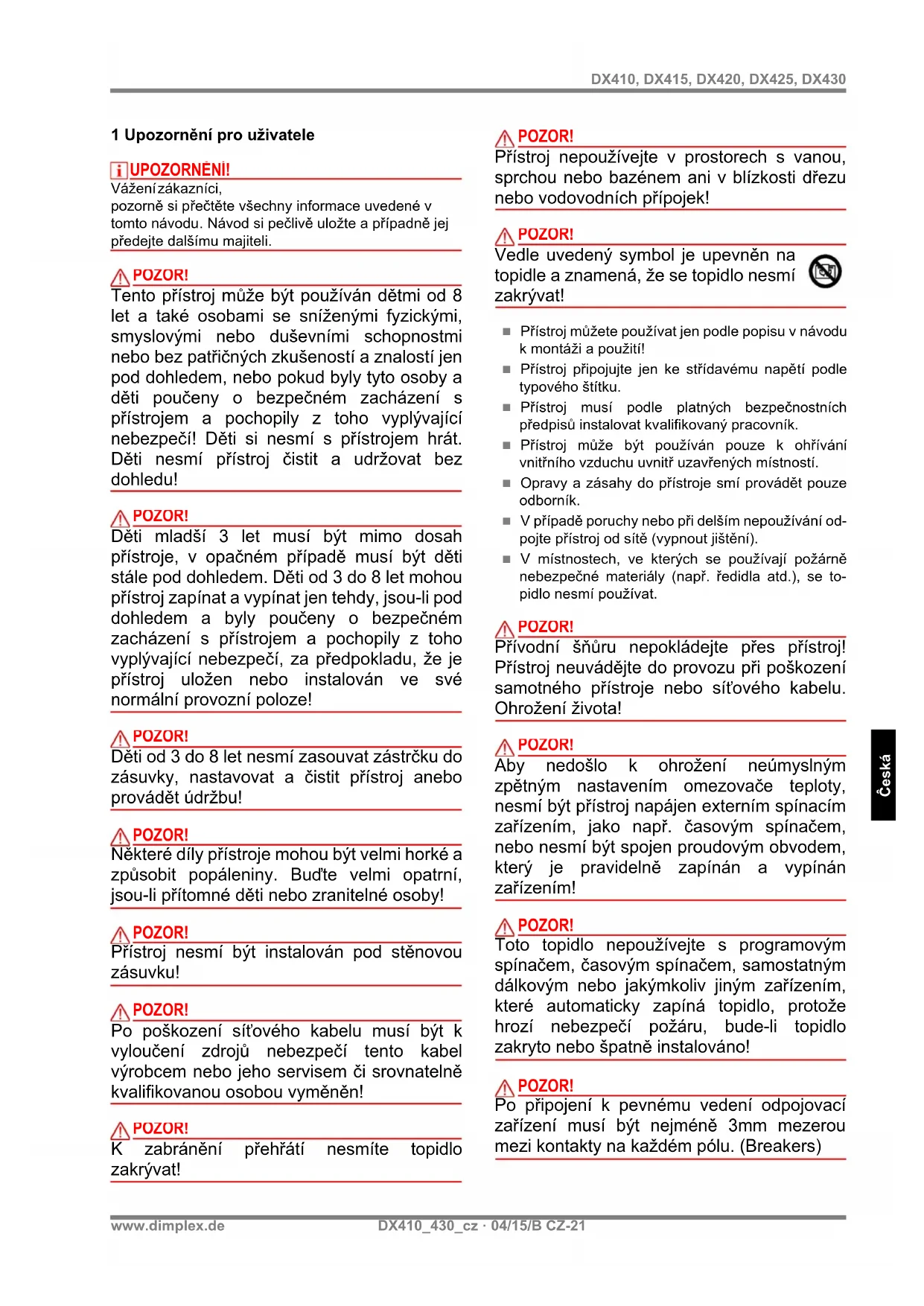 (mm) Hlou bka (mm) Hmot- nost DX 410 1000 W 575 350 124 4,1 kg DX 415 1500 W 575 350 124 4,1 kg DX 420 2000 W 575 350 124 4,1 kg DX425 2500 W 695 350 124 4,8 kg DX 430 3000 W 695 350 124 4,8 kg Typ Výkon A (mm) DX 410 1000 W 354 DX 415 1500 W 354 DX 420 2000 W 354 DX 425 2500 W 476 DX 430 3000 W 476www.dimplex.de DX410_430_cz · 04/15/B CZ-23 Ĉeská DX410, DX415, DX420, DX425, DX430 Topné zařízení se zapíná nebo vypíná pomocí síťo- vého vypínače (D). Pomocí spínače druhu provozu (E) můžete přepínat mezi dvěma stupni vytápění (I = 1000 W nebo II = 2000 W). Pokud zařízení vytápí, svítí červená kontrolka. POZOR! V závislosti na velikosti místnosti, spotřebě tepla a nastavení termostatu může při nehlídaném vytápění dojít k přetopení místností. To může znamenat nebezpečí pro osoby, které nejsou schopny v případě nadměrné teploty místnost opustit. 6 Ochrana proti přehřátí V případě nepřípustného zahřátí se topné zařízení au- tomaticky vypne. V takové případě odpojte síťový ko- nektor a zařízení nechte na několik minut odpojené, aby termostat opět mohl přepnout zpět. Poté odstraňte možné příčiny, např. posunutá nebo za- krytá vzduchová mřížka. Po dostatečném ochladnutí zařízení může být toto opět uvedeno do provozu. 7 Poruchy Pokud topné zařízení neodevzdává teplo, zkontrolujte, zda je zařízení zapnuto a termostat je nastaven na po- žadovanou teplotu, zkontrolujte také, zda je zapnutý automat v rozdělení proudu resp. zda je v pořádku po- jistka. Pokud nelze poruchu odstranit, kontaktujte nejbližší pobočku služby pro zákazníky. Při zpracování zakázky je potřebné uvedení E-čísla a FD-číslice zařízení. Tyto údaje se nachází na typovém štítku. Opravy a zásahy na zařízení smí provádět pouze od- borník v oboru elektro nebo služba pro zákazníky. 8 Zákaznický servis V případě služby pro zákazníky musí být informována společnost Robert Bosch Hausgeräte GmbH jako pří- slušná služba pro zákazníky. Kontaktní údaje viz strana 2 „Záruka, služba pro zákazníky, adresa“. 9 Čištění Při čištění musí být zařízení odpojeno od sítě a být ochlazeno. Vnější stranu můžete čistit měkkým, vlh- kým hadříkem. Při čištění nepoužívejte čisticí prášky nebo politury na nábytek, tyto mohou poškodit povrch zařízení. Nánosy prachu v zařízení můžete zvenku vysát vysa- vačem. 10 Záruka Na tento výrobek přebíráme záruku 2 roky v souladu s našimi záručními podmínkami. 11 Upozornění k likvidaci Zařízení nelikvidujte v obvyklém domovním odpadu, ale v místním likvidačním místě.CZ-24 DX410_430_cz · 04/15/B www.dimplex.de Ĉeská DX410, DX415, DX420, DX425, DX430 Glen Dimplex Deutschland GmbH Am Goldenen Feld 18 D-95326 Kulmbach Technické změny vyhrazeny Telefon: +49 9221 709-564 Fax: +49 9221 709-589 E-mail: 09221709589@dimplex.de www.dimplex.de