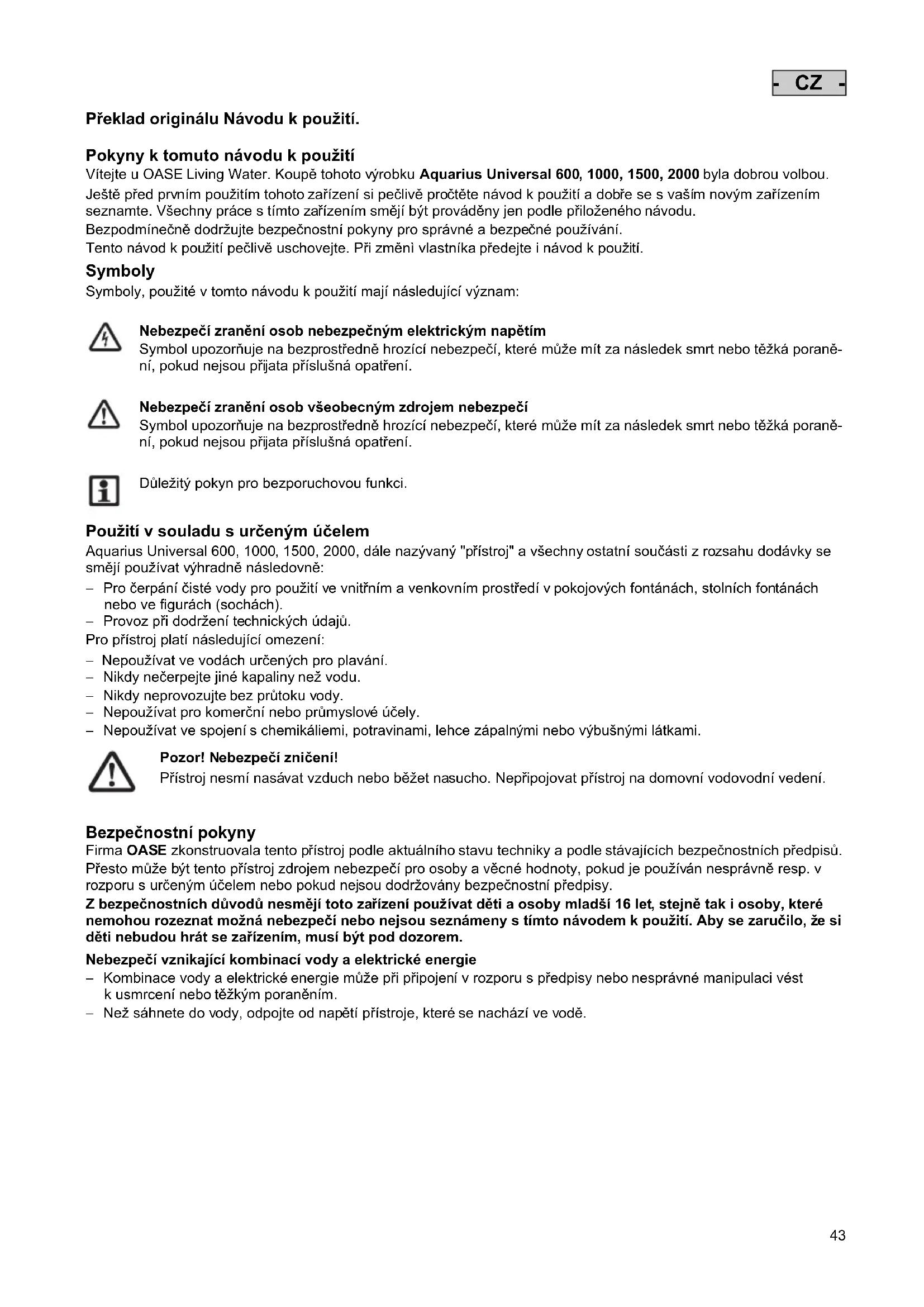 Urządzenie należy przechowywać zanurzone w wodzie lub napełnione wodą, w miejscu nienarażonym na działanie mrozu. Nie zanurzyć wtyczki w wodzie! Naprawa Uszkodzonej obudowy nie można poddać naprawie. Zabrania się eksploatacji urządzenia z uszkodzoną obudową. Urządzenie usunąć zgodnie z zasadami utylizacji odpadów.43 - CZ - Překlad originálu Návodu k použití. Pokyny k tomuto návodu k použití Vítejte u OASE Living Water. Koupě tohoto výrobku Aquarius Universal 600, 1000, 1500, 2000 byla dobrou volbou. Ještě před prvním použitím tohoto zařízení si pečlivě pročtěte návod k použití a dobře se s vaším novým zařízením seznamte. Všechny práce s tímto zařízením smějí být prováděny jen podle přiloženého návodu. Bezpodmínečně dodržujte bezpečnostní pokyny pro správné a bezpečné používání. Tento návod k použití pečlivě uschovejte. Při změnì vlastníka předejte i návod k použití. Symboly Symboly, použité v tomto návodu k použití mají následující význam: