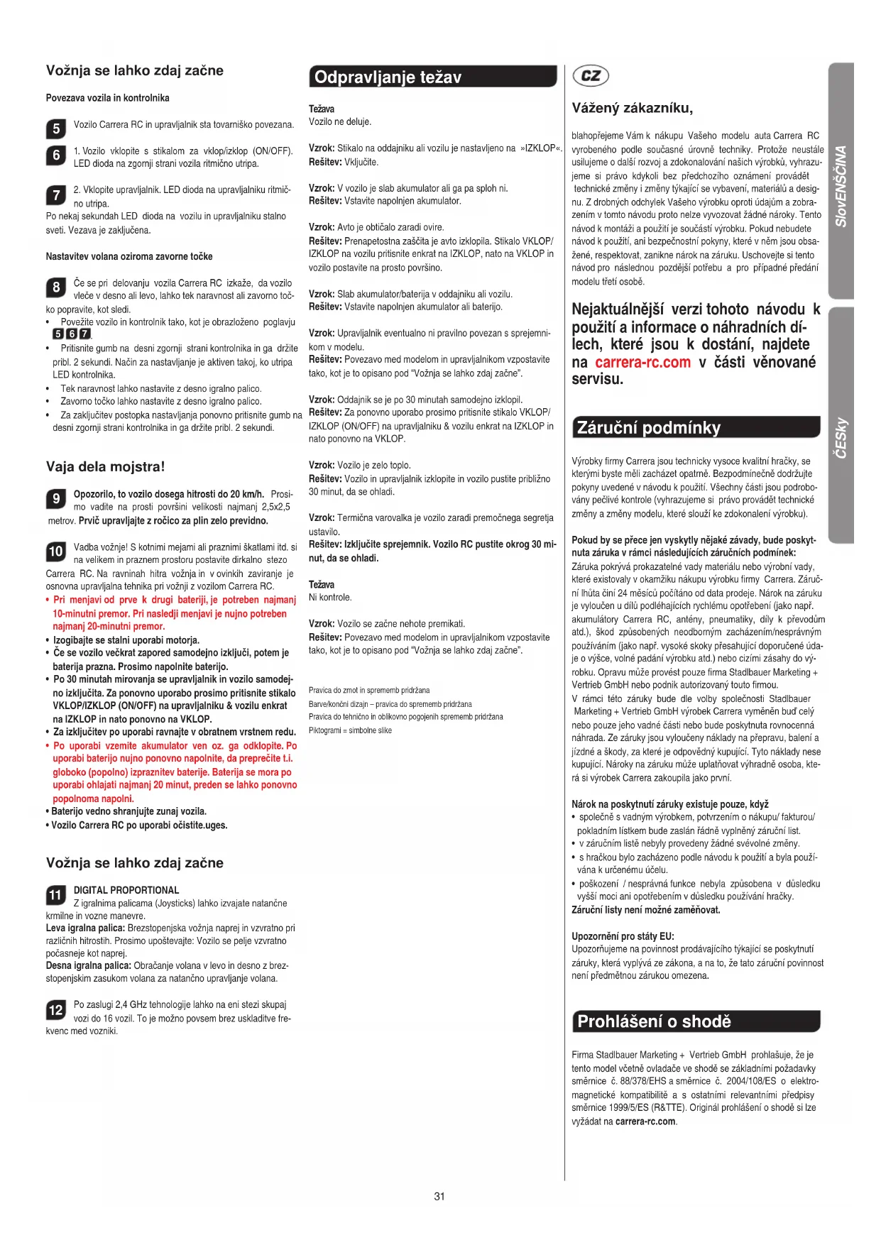- poškození / nesprávná funkce nebyla způsobena v důsledku vyšší moci ani opotřebením v důsledku používání hračky. Záruční listy není možné zaměňovat. Upozornění pro státy EU: Upozorňujeme na povinnost prodávajícího týkající se poskytnutí záruky, která vyplývá ze zákona, a na to, že tato záruční povinnost není předmětnou zárukou omezena. Prohlášení o shodě Firma Stadlbauer Marketing + Vertrieb GmbH prohlašuje, že je tento model včetně ovladače ve shodě se základními požadavky směrnice č. 88/378/EHS a směrnice č. 2004/108/ES o elektro- magnetické kompatibilitě a s ostatními relevantními předpisy směrnice 1999/5/ES (R&TTE). Originál prohlášení o shodě si lze vyžádat na carrera-rc.com. SlovENščINAčESk y32
