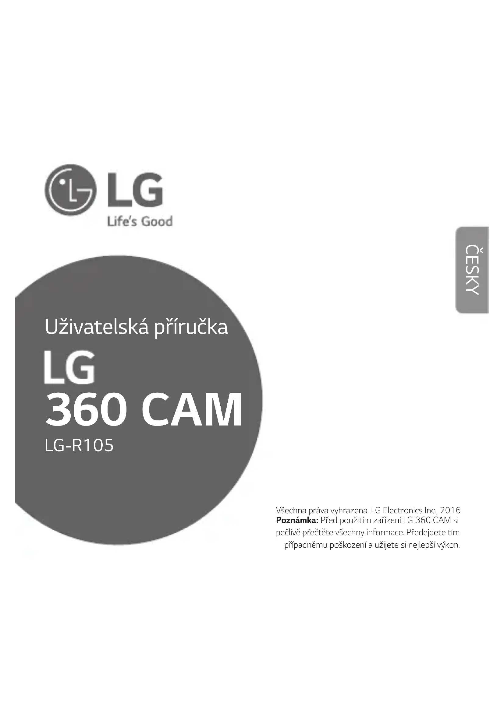 - ProaktualizacisoftwarumoduluLG360CAMjevyžadovánprogramLGBridgealzeje stáhnoutzwebovýchstránekspolečnostiLGElectronics(http://www.lg.com). Nápověda Stisknutímtlačítka otevřeteNápovědu.16 Specikacerozhraní Bluetooth Verze 4.1 SpecikacesítěWi-Fi 802.11 b/g/n Typ USB USB 2.0 typu C Baterie 1 200 mAh Dobanabíjení 130minut(nabíjenímůžetrvatdéle,pokudje zařízeníLG360CAMzapnuté.) Optika 13MP,206°x2(duálníobjektivtypurybíoko) MaximálníRozlišenívidea 2560x1280(30snímků/s) MaximálníRozlišenífotograe 5 660 x 2 830 (16 MP) Formátsouborufotograe/videa Fotograe:JPEG;Video:MP4(MPEG-4AVC/H.264, Zvuk:AAC5.1kanálový) Záznam Sférické/polosférickéfotograeavidea Zvuk 3 mikrofony ExterníkartaSD Až2TB Rozměry/hmotnost 40 x 97 x 25 mm / 76,7 g DoporučujemepoužítpaměťovoukartuSDUHS-1(U3)pročtení/zápissrychlostí10MB/s nebovyšší.(třída10nebovyšší). ZařízeníLG360CAMpodporujeslužbyGoogleStreetView™aYouTube™360°. Specikaceafunkce works with17 Likvidace starého přístroje 1Tentosymbolpřeškrtnutéhokošeznačí,žeodpadzelektrickýcha elektronickýchvýrobků(WEEE)jenutnélikvidovatodděleněodlinky komunálníhoodpadu. 2Staréelektrickévýrobkymohouobsahovatnebezpečnélátky,takžesprávná likvidacestarýchpřístrojůpomůžezabránitpotenciálnímnegativnímdůsledkům proživotníprostředíalidskézdraví.Starépřístrojemohouobsahovatznovu použitelnédíly,kterélzepoužítkopravědalšíchvýrobkůadalšícennémateriály, kterélzerecyklovatašetřittakomezenézdroje. 3Přístrojmůžetezanéstbuďdoobchodu,kdejstehozakoupilineboseobrátit namístnísprávukomunálníchodpadů,kdezískátepodrobnéinformaceo autorizovanémsběrnémmístěWEEE.Proposledníaktuálníinformacezvaší zeměsiprosímprostudujtewebwww.lg.com/global/recycling Doplňujícíinformace18 Likvidace použitých baterií/akumulátorů 1Tentosymbolmůžebýtkombinovánschemickýmiznačkamirtuti(Hg), kadmia(Cd)neboolova(Pb),pokudbaterieobsahujevícenež0,0005%rtuti, 0,002 % kadmia nebo 0,004 % olova. 2Všechnybaterie/akumulátorybymělybýtlikvidoványodděleněodběžného komunálníhoodpaduprostřednictvímsběrnýchzařízenízřízenýchzatímto účelemvládounebomístnísamosprávou. 3Správnýzpůsoblikvidacestarýchbaterií/akumulátorůpomáházamezitmožným negativnímvlivůmnaživotníprostředíazdravízvířatalidí. 4Bližšíinformaceolikvidacistarýchbaterií/akumulátorůzískáteumístní samosprávy,vesběrnémzařízenínebovobchodě,vekterémjstevýrobek zakoupili.19 Vystavení energii rádiové frekvence Informaceovystavenírádiovýmvlnámaspecickémířepohlcení(SAR–SpecicAbsorption Rate). TentomodelzařízeníLG-R105bylnavržentak,abyvyhovělpříslušnýmbezpečnostním požadavkůmohledněvystavenírádiovýmvlnám.Uvedenépožadavkyjsouzaloženyna odbornýchsměrnicích,ježzahrnujíbezpečnostnírezervy,kterézaručujíbezpečívšemlidem bezohledunavěkazdraví.