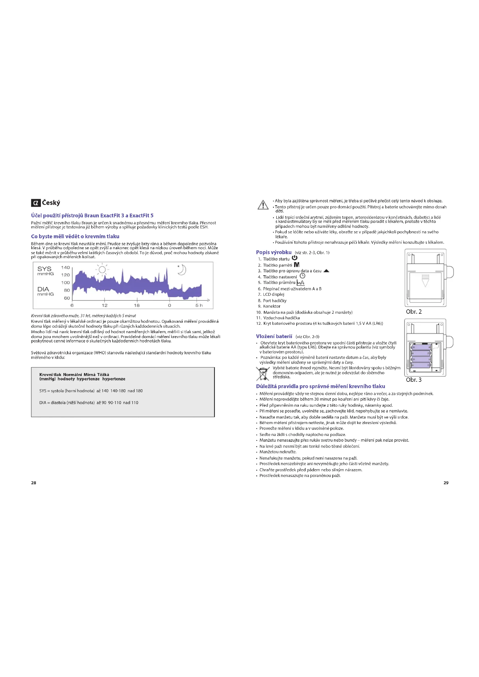 Český Účel použití přístrojů Braun ExactFit 3 a ExactFit 5 Pažní měřič krevního tlaku Braun je určen k snadnému a přesnému měření krevního tlaku. Přesnost měření přístroje je testována již během výroby a splňuje požadavky klinických testů podle ESH. Co byste měli vědět o krevním tlaku Během dne se krevní tlak neustále mění. Prudce se zvyšuje brzy ráno a během dopoledne pozvolna klesá. V průběhu odpoledne se opět zvýší a nakonec opět klesá na nízkou úroveň během noci. Může se také měnit v průběhu velmi krátkých časových období. To je důvod, proč mohou hodnoty získané při opakovaných měřeních kolísat. Krevní tlak zdravého muže, 31 let, měřený každých 5 minut Krevní tlak měřený v lékařské ordinaci je pouze okamžitou hodnotou. Opakovaná měření prováděná doma lépe odrážejí skutečné hodnoty tlaku při různých každodenních situacích. Mnoho lidí má navíc krevní tlak odlišný od hodnot naměřených lékařem, měří-li si tlak sami, jelikož doma jsou mnohem uvolněnější než v ordinaci. Pravidelné domácí měření krevního tlaku může lékaři poskytnout cenné informace o skutečných každodenních hodnotách tlaku. Světová zdravotnická organizace (WHO) stanovila následující standardní hodnoty krevního tlaku měřeného v klidu: Krevní tlak Normální Mírná Těžká (mmHg) hodnoty hypertenze hypertenze SYS = systola (horní hodnota) až 140 140-180 nad 180 DIA = diastola (nižší hodnota) až 90 90-110 nad 110