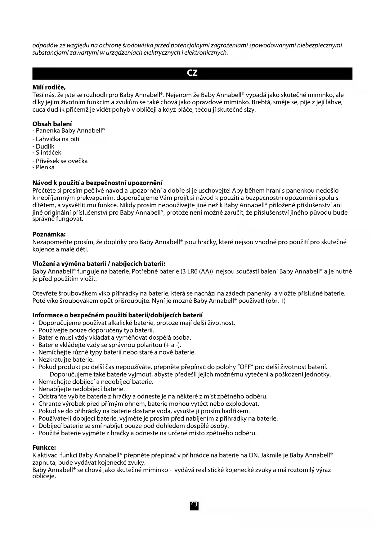 Milí rodiče, Těšínás,žejsteserozhodliproBabyAnnabell®.NejenomžeBabyAnnabell®vypadájakoskutečnémiminko,ale díkyjejímživotnímfunkcímazvukůmsetakéchovájakoopravdovémiminko.Brebtá,smějese,pijezjejíláhve, cucádudlíkpřičemžjevidětpohybvobličejiakdyžpláče,tečoujískutečnéslzy. Obsah balení - Panenka Baby Annabell® -Lahvičkanapití -Dudlík - Slintáček -Přívěsekseovečka - Plenka Návod k použití a bezpečnostní upozornění Přečtětesiprosímpečlivěnávodaupozorněníadobřesijeuschovejte!Abyběhemhraníspanenkounedošlo knepříjemnýmpřekvapením,doporučujemeVámprojítsinávodkpoužitíabezpečnostníupozorněníspolus dítětem,avysvětlitmufunkce.NikdyprosímnepoužívejtejinénežkBabyAnnabell®přiloženépříslušenstvíani jinéoriginálnípříslušenstvíproBabyAnnabell®,protoženenímožnézaručit,žepříslušenstvíjinéhopůvodubude správně fungovat. Poznámka: Nezapomeňteprosím,žedoplňkyproBabyAnnabell®jsouhračky,kterénejsouvhodnépropoužitíproskutečné kojenceamaléděti. Vložení a výměna baterií / nabíjecích baterií: BabyAnnabell®fungujenabaterie.Potřebnébaterie(3LR6(AA))nejsousoučástíbaleníBabyAnnabell®ajenutné jepředpoužitímvložit. Otevřetešroubovákemvíkopřihrádkynabaterie,kterásenacházínazádechpanenkyavložtepříslušnébaterie. Potévíkošroubovákemopětpřišroubujte.NyníjemožnéBabyAnnabell®používat!(obr.1) Informace o bezpečném použití baterií/dobíjecích baterií