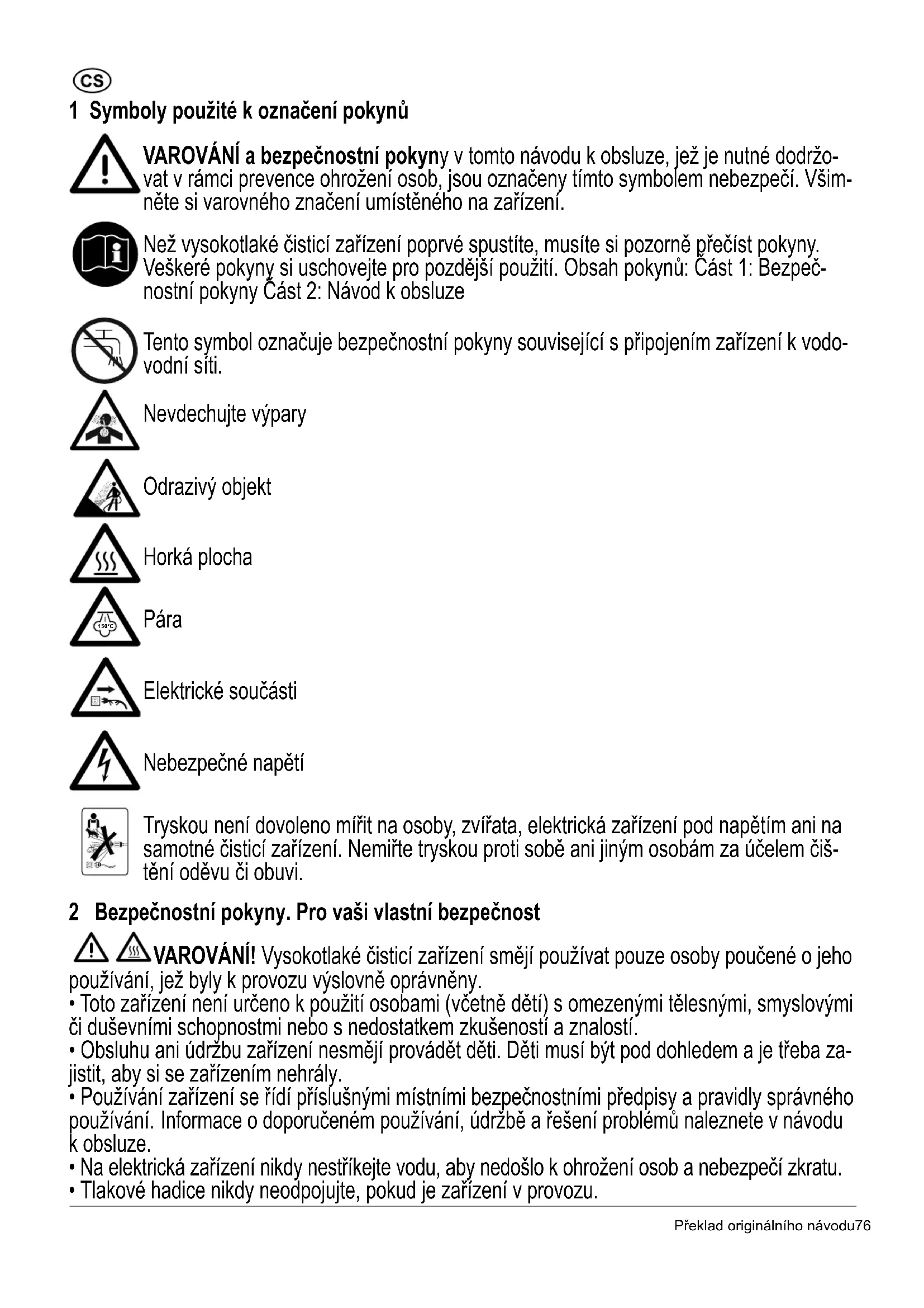 - Aby sa v prípade, že je poškodený napájací kábel, predišlo nebezpečenstvu, musí ho vymeniť výrobca, jeho servisný technik alebo podobne kvalifikované osoby.Překlad originálního návodu76 1 Symboly použité k označení pokynů VAROVÁNÍ a bezpečnostní pokyny v tomto návodu k obsluze, jež je nutné dodržo- vat v rámci prevence ohrožení osob, jsou označeny tímto symbolem nebezpečí. Všim- něte si varovného značení umístěného na zařízení. Než vysokotlaké čisticí zařízení poprvé spustíte, musíte si pozorně přečíst pokyny. Veškeré pokyny si uschovejte pro pozdější použití. Obsah pokynů: Část 1: Bezpeč- nostní pokyny Část 2: Návod k obsluze Tento symbol označuje bezpečnostní pokyny související s připojením zařízení k vodo- vodní síti. Nevdechujte výpary Odrazivý objekt Horká plocha Pára Elektrické součásti Nebezpečné napětí Tryskou není dovoleno mířit na osoby, zvířata, elektrická zařízení pod napětím ani na samotné čisticí zařízení. Nemiřte tryskou proti sobě ani jiným osobám za účelem čiš- tění oděvu či obuvi. 2 Bezpečnostní pokyny. Pro vaši vlastní bezpečnost VAROVÁNÍ! Vysokotlaké čisticí zařízení smějí používat pouze osoby poučené o jeho používání, jež byly k provozu výslovně oprávněny.