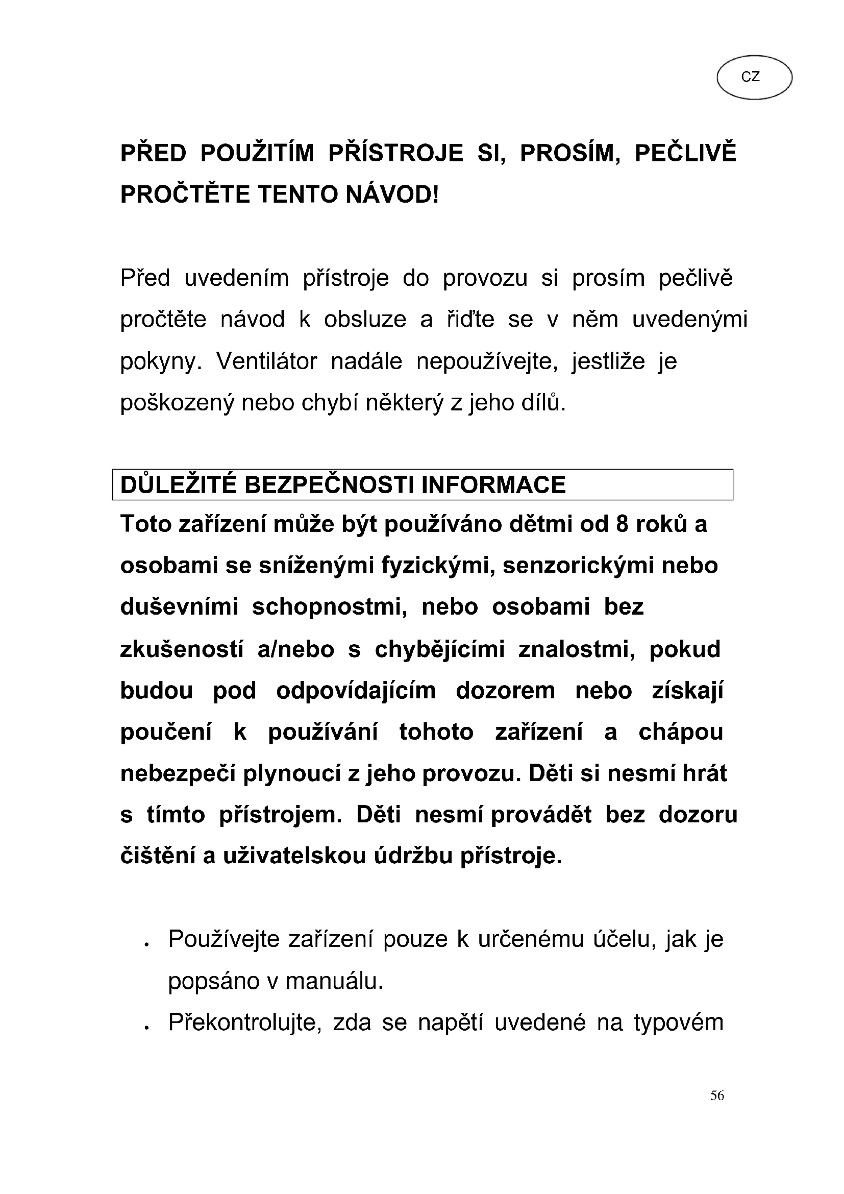 Toto zařízení může být používáno dětmi od 8 roků a osobami se sníženými fyzickými, senzorickými nebo duševními schopnostmi, nebo osobami bez zkušeností a/nebo s chybějícími znalostmi, pokud budou pod odpovídajícím dozorem nebo získají poučení k používání tohoto zařízení a chápou nebezpečí plynoucí z jeho provozu. Děti si nesmí hrát s tímto přístrojem. Děti nesmí provádět bez dozoru čištění a uživatelskou údržbu přístroje. Používejte zařízení pouze k určenému účelu, jak je popsáno v manuálu. Překontrolujte, zda se napětí uvedené na typovém CZ57 štítku (220-240V - 50/60Hz) shoduje s napětím v síti. Elektrický kabel nesmí být zakrýván. Přístroj připojte k elektrickému napětí v místě, kde nikdo nemůže zakopnout o jeho elektrický kabel. Ujistěte se, že při provozu zařízení na pevný a rovný povrch. Jestliže přístroj nepoužíváte, vytáhněte elektrický kabel ze zásuvky. Netahejte při tom za kabel, ale za zástrčku. Ujistěte se, že se v blízkosti ventilátoru nenacházejí žádné předměty, které mohou bránit v jeho oscilaci. Nikdy nedávejte prsty, pero nebo jiných předmětů přes mřížku, když je zařízení v provozu. Dbejte na to, aby se vedle zařízení nenacházely záclony, ubrusy, součásti oděvů, závěsy, vlasy apod. Mohou být nasáty do otvoru ventilátoru, což může vést k poškozením nebo poraněním. Vezměte přístroj v provozu, je-li šňůra nebo zástrčka je poškozena nebo nefunguje správně nebo byl jinak poškozen. Zkontrolujte, zda je napájecí kabel před každým použitím na trhliny nebo jiné známky opotřebení a58 nechte jej zkontrolovat zařízení av případě potřeby vyměnit napájecí kabel. Prosím, obraťte se na specialistu, nebo jeho pověřený zástupce. Zabalte šňůra těsně kolem zařízení. Ventilátor může být poškozen. Produkt je určen pro domácí použití a ne pro obchodní a průmyslové využití. Přístroj, zástrčka nebo kabel se nesmí dostat do kontaktu s vodou nebo vodními parami, či nesmí být postříkáván kapalinami. Přístroj neprovozujte v blízkosti vany, sprchy, bazénu nebo v prádelně. Přístroj neprovozujte s jinými polovodičovými regulátory otáček (např. stmívač) Ventilátor má být za provozu ve vzpřímené poloze a nikdy nesmí ležet na boku. Vezměte si zařízení v blízkosti výbušných a hořlavých plynů v provozu Před čištěním přístroje zástrčku ze zásuvky. Pokud je síťový kabel poškozený, je nutné, aby ho vyměnil prodávajícím nebo jeho servisním zástupcem, nebo podobně kvalifikovanou osobou, aby se předešlo možnému nebezpečí.59