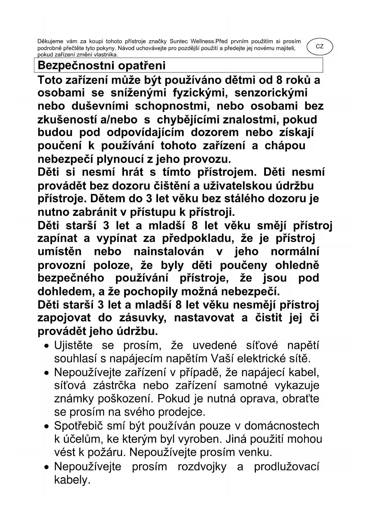 CoolBreeze SUNTEC WELLNESS GMBH / HOLZSTRASSE 2 / 40 221 DÜSSELDORF / GERMANYDěkujeme vám za koupi tohoto přístroje značky Suntec Wellness.Před prvním použitím si prosím podrobně přečtěte tyto pokyny. Návod uchovávejte pro pozdější použití a předejte jej novému majiteli, pokud zařízení změní vlastníka. Bezpe čnostni opatřeni Toto zařízení může být používáno dětmi od 8 roků a osobami se sníženými fyzickými, senzorickými nebo duševními schopnostmi, nebo osobami bez zkušeností a/nebo s chybějícími znalostmi, pokud budou pod odpovídajícím dozorem nebo získají poučení k používání tohoto zařízení a chápou nebezpečí plynoucí z jeho provozu. Děti si nesmí hrát s tímto přístrojem. Děti nesmí provádět bez dozoru čištění a uživatelskou údržbu přístroje. Dětem do 3 let věku bez stálého dozoru je nutno zabránit v přístupu k přístroji. Děti starší 3 let a mladší 8 let věku smějí přístroj zapínat a vypínat za předpokladu, že je přístroj umístěn nebo nainstalován v jeho normální provozní poloze, že byly děti poučeny ohledně bezpečného používání přístroje, že jsou pod dohledem, a že pochopily možná nebezpečí. Děti starší 3 let a mladší 8 let věku nesmějí přístroj zapojovat do zásuvky, nastavovat a čistit jej či provádět jeho údržbu.