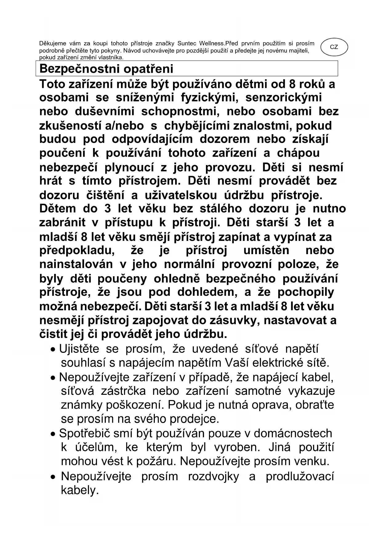 CoolBreeze SUNTEC WELLNESS GMBH / HOLZSTRASSE 2 / 40 221 DÜSSELDORF / GERMANYDěkujeme vám za koupi tohoto přístroje značky Suntec Wellness.Před prvním použitím si prosím podrobně přečtěte tyto pokyny. Návod uchovávejte pro pozdější použití a předejte jej novému majiteli, pokud zařízení změní vlastníka. Bezpe čnostni opatřeni Toto zařízení může být používáno dětmi od 8 roků a osobami se sníženými fyzickými, senzorickými nebo duševními schopnostmi, nebo osobami bez zkušeností a/nebo s chybějícími znalostmi, pokud budou pod odpovídajícím dozorem nebo získají poučení k používání tohoto zařízení a chápou nebezpečí plynoucí z jeho provozu. Děti si nesmí hrát s tímto přístrojem. Děti nesmí provádět bez dozoru čištění a uživatelskou údržbu přístroje. Dětem do 3 let věku bez stálého dozoru je nutno zabránit v přístupu k přístroji. Děti starší 3 let a mladší 8 let věku smějí přístroj zapínat a vypínat za předpokladu, že je přístroj umístěn nebo nainstalován v jeho normální provozní poloze, že byly děti poučeny ohledně bezpečného používání přístroje, že jsou pod dohledem, a že pochopily možná nebezpečí. Děti starší 3 let a mladší 8 let věku nesmějí přístroj zapojovat do zásuvky, nastavovat a čistit jej či provádět jeho údržbu.