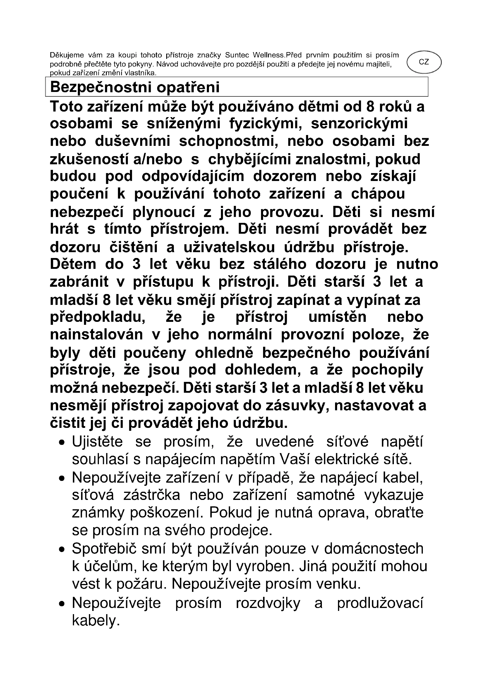 CoolBreeze SUNTEC WELLNESS GMBH / HOLZSTRASSE 2 / 40 221 DÜSSELDORF / GERMANYDěkujeme vám za koupi tohoto přístroje značky Suntec Wellness.Před prvním použitím si prosím podrobně přečtěte tyto pokyny. Návod uchovávejte pro pozdější použití a předejte jej novému majiteli, pokud zařízení změní vlastníka. Bezpe čnostni opatřeni Toto zařízení může být používáno dětmi od 8 roků a osobami se sníženými fyzickými, senzorickými nebo duševními schopnostmi, nebo osobami bez zkušeností a/nebo s chybějícími znalostmi, pokud budou pod odpovídajícím dozorem nebo získají poučení k používání tohoto zařízení a chápou nebezpečí plynoucí z jeho provozu. Děti si nesmí hrát s tímto přístrojem. Děti nesmí provádět bez dozoru čištění a uživatelskou údržbu přístroje. Dětem do 3 let věku bez stálého dozoru je nutno zabránit v přístupu k přístroji. Děti starší 3 let a mladší 8 let věku smějí přístroj zapínat a vypínat za předpokladu, že je přístroj umístěn nebo nainstalován v jeho normální provozní poloze, že byly děti poučeny ohledně bezpečného používání přístroje, že jsou pod dohledem, a že pochopily možná nebezpečí. Děti starší 3 let a mladší 8 let věku nesmějí přístroj zapojovat do zásuvky, nastavovat a čistit jej či provádět jeho údržbu.