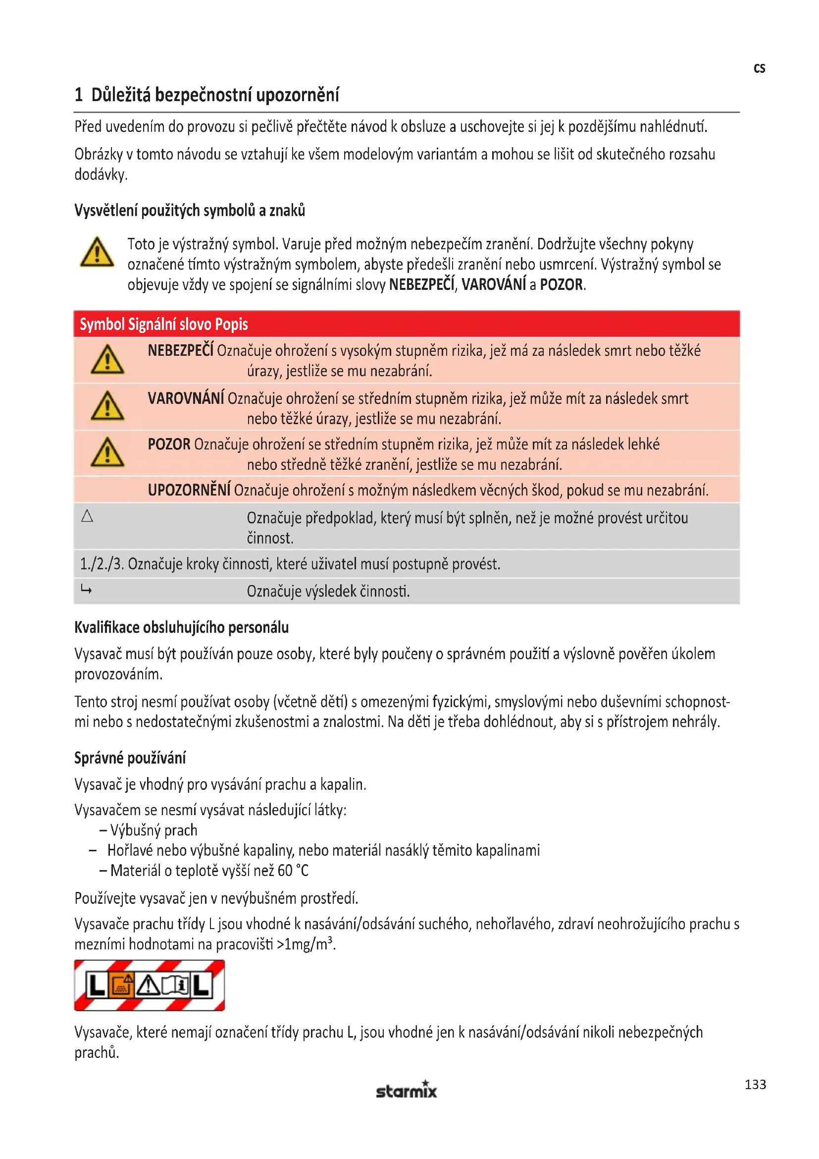 Vysavače, které nemají označení třídy prachu L, jsou vhodné jen k nasávání/odsávání nikoli nebezpečných prachů.