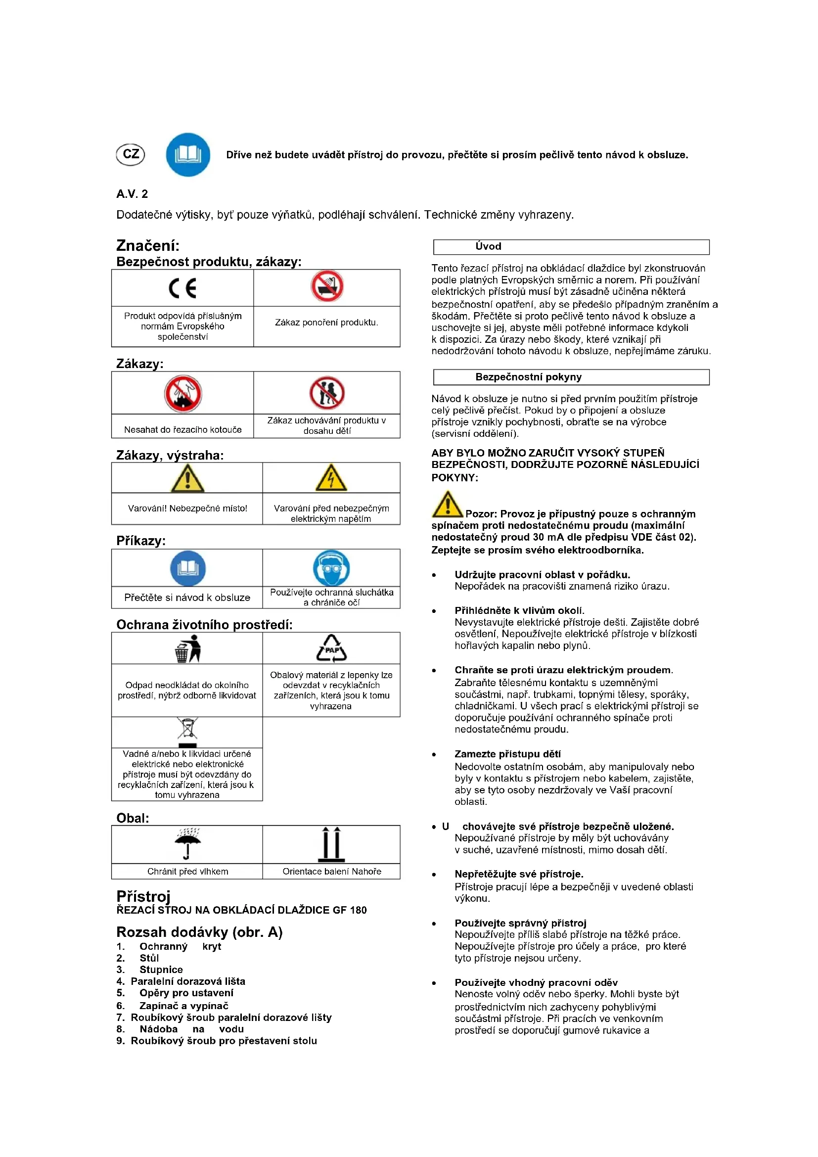 Varování! Nebezpečné místo! Varování před nebezpečným elektrickým napětím Příkazy: Přečtěte si návod k obsluze Používejte ochranná sluchátka a chrániče očí Ochrana životního prostředí: Odpad neodkládat do okolního prostředí, nýbrž odborně likvidovat Obalový materiál z lepenky lze odevzdat v recyklačních zařízeních, která jsou k tomu vyhrazena Vadné a/nebo k likvidaci určené elektrické nebo elektronické přístroje musí být odevzdány do recyklačních zařízení, která jsou k tomu vyhrazena Obal: Chránit před vlhkem Orientace balení Nahoře Přístroj ŘEZACÍ STROJ NA OBKLÁDACÍ DLAŽDICE GF 180 Rozsah dodávky (obr. A)