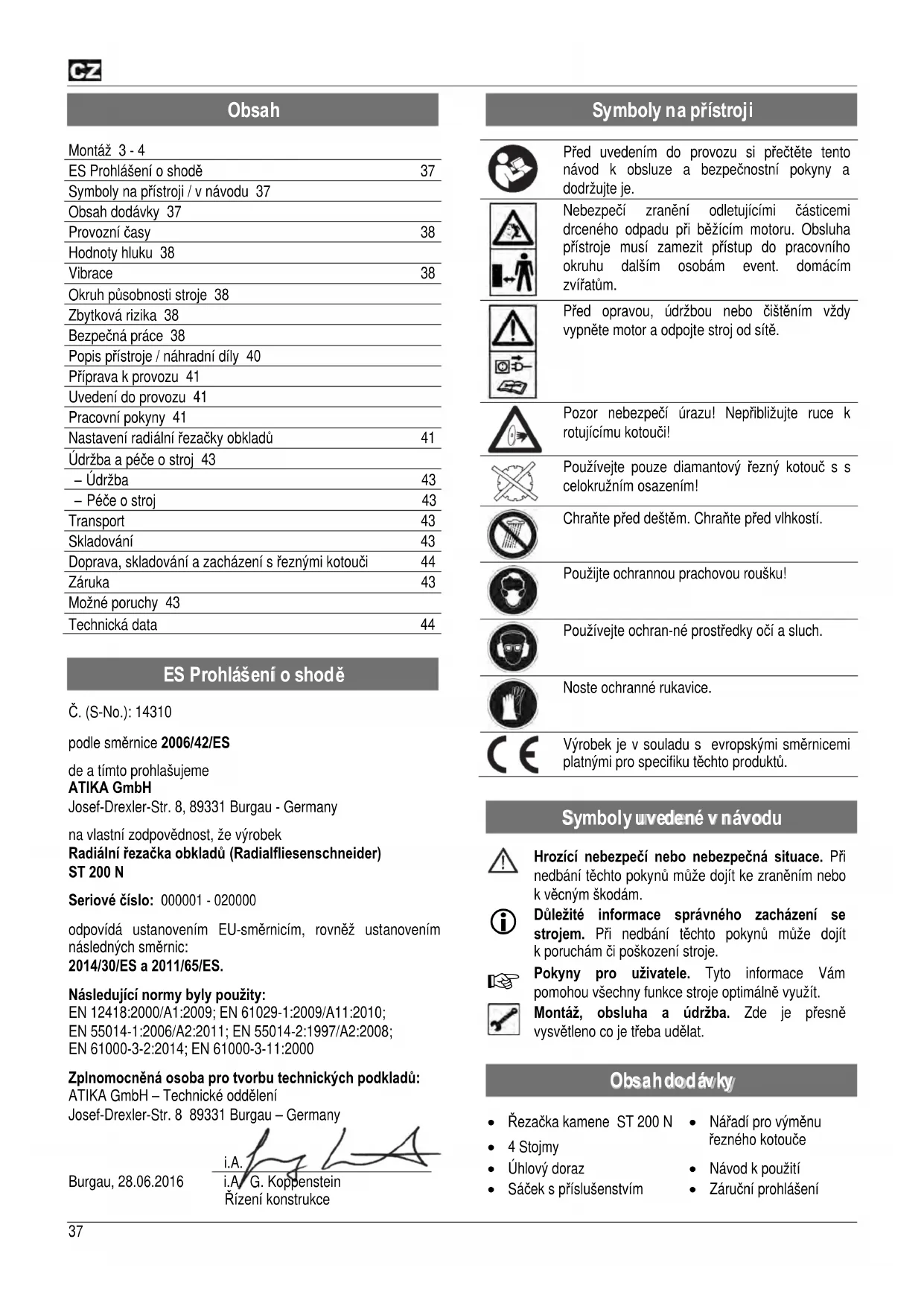 Č. (S-No.): 14310 podle směrnice 2006/42/ES de a tímto prohlašujeme ATIKA GmbH Josef-Drexler-Str. 8, 89331 Burgau - Germany na vlastní zodpovědnost, že výrobek Radiální řezačka obkladů (Radialfliesenschneider) ST 200 N Seriové číslo: 000001 - 020000 odpovídá ustanovením EU-směrnicím, rovněž ustanovením následných směrnic: 2014/30/ES a 2011/65/ES. Následující normy byly použity: EN 12418:2000/A1:2009; EN 61029-1:2009/A11:2010; EN 55014-1:2006/A2:2011; EN 55014-2:1997/A2:2008; EN 61000-3-2:2014; EN 61000-3-11:2000 Zplnomocněná osoba pro tvorbu technických podkladů: ATIKA GmbH – Technické oddělení Josef-Drexler-Str. 8 89331 Burgau – Germany