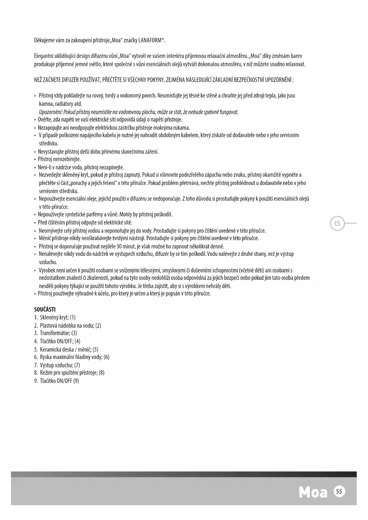 Děkujeme vám za zakoupení přístroje„Moa“ značky LANAFORM®. Elegantní uklidňující design difuzéru vůní „Moa“ vytvoří ve vašem interiéru příjemnou relaxační atmosféru. „Moa“ díky změnám barev produkuje příjemné jemné světlo, které společně s vůní esenciálních olejů vytváří dokonalou atmosféru, v níž můžete snadno relaxovat. NEŽ ZAČNETE DIFUZÉR POUŽÍVAT, PŘEČTĚTE SI VŠECHNY POKYNY, ZEJMÉNA NÁSLEDUJÍCÍ ZÁKLADNÍ BEZPEČNOSTNÍ UPOZORNĚNÍ :