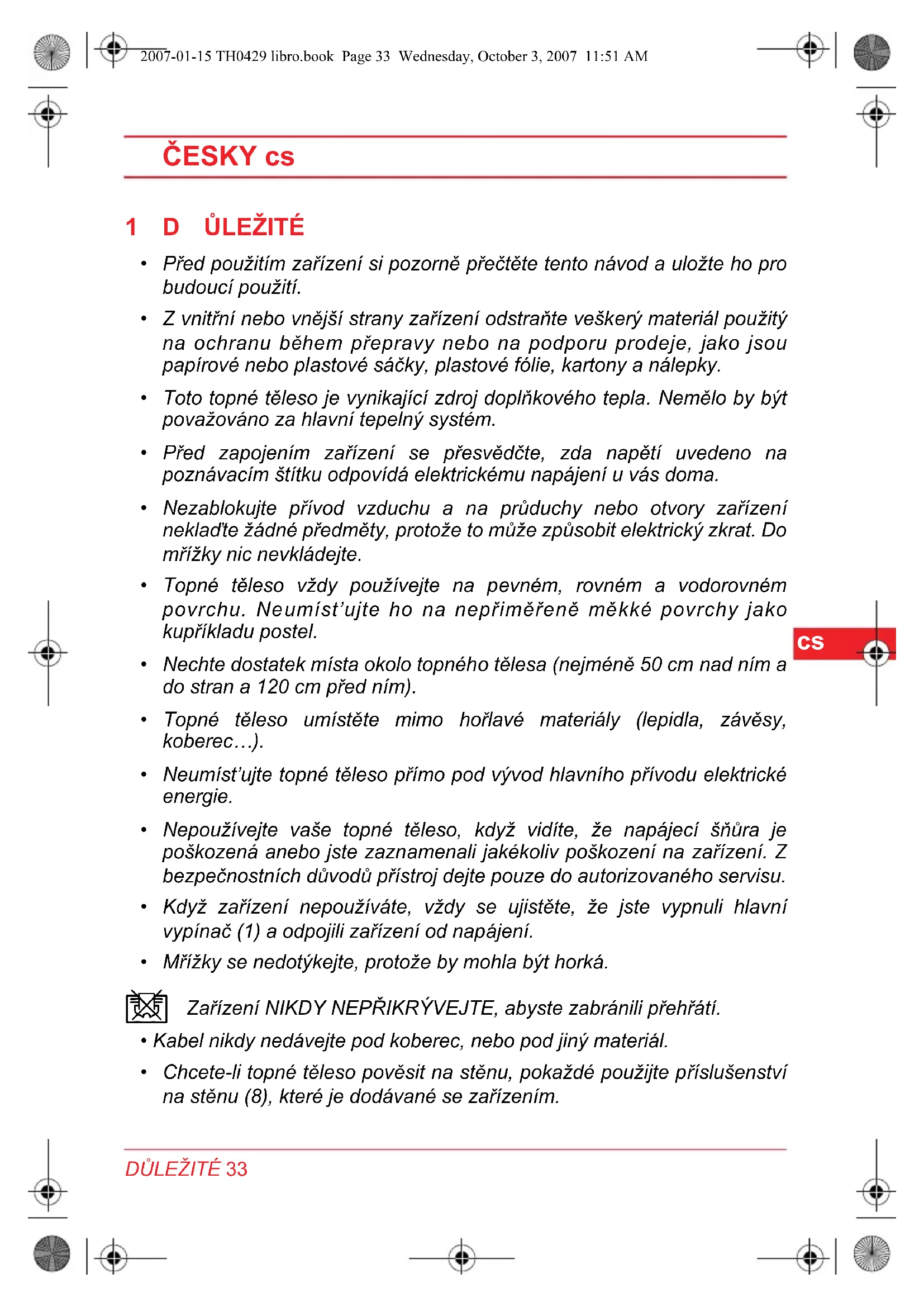 - Topné těleso nepoužívejte k sušeni oděvů a nedávejte prěd nej nábytek blíze než 50 cm od prědní strany zarízení, ani jej nedávejte do mistrnosti, ve kterych je měné než 4 m² podlahové plochy.