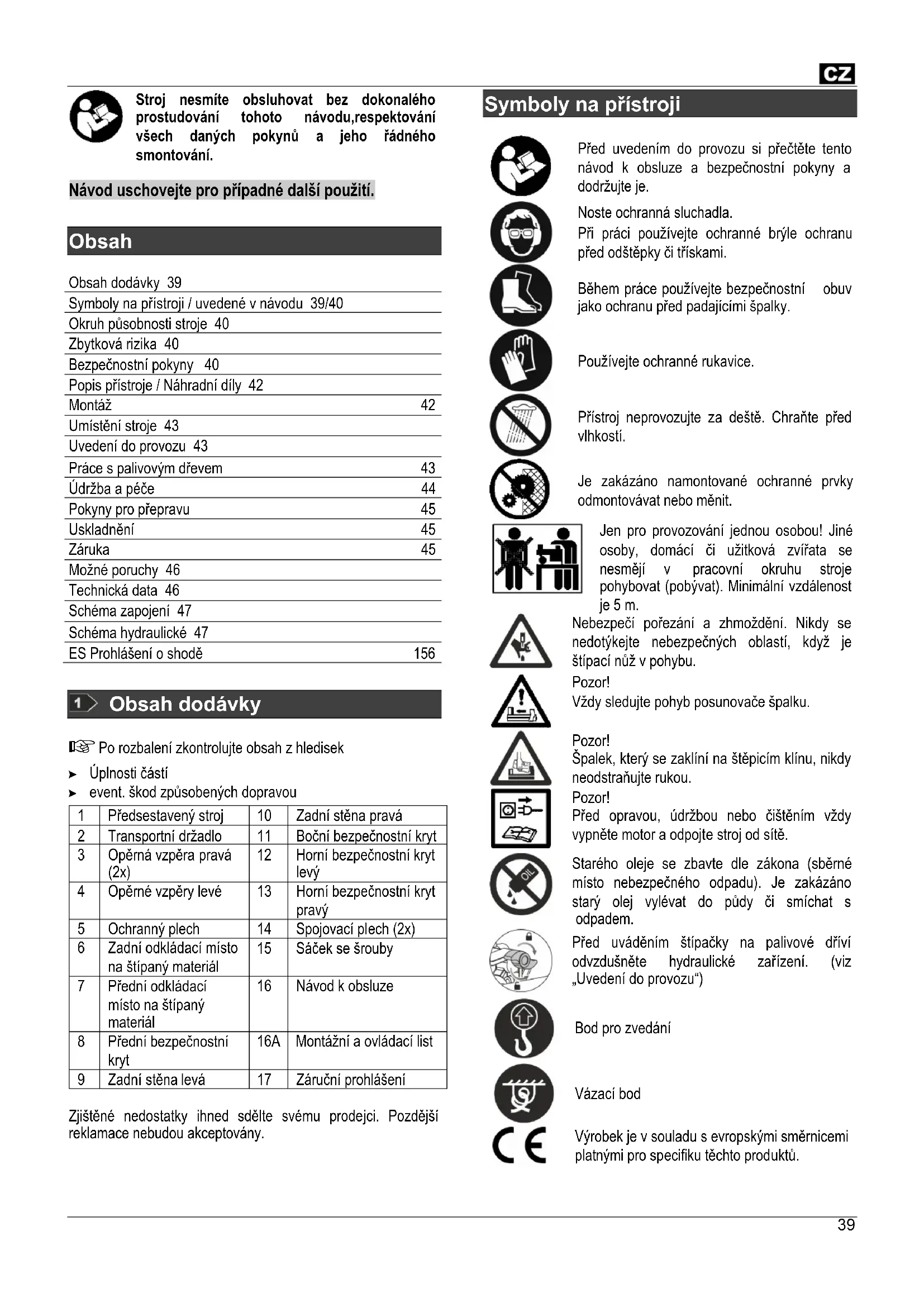Obsah Obsah dodávky 39 Symboly na přístroji / uvedené v návodu 39/40 Okruh působnosti stroje 40 Zbytková rizika 40 Bezpečnostní pokyny 40 Popis přístroje / Náhradní díly 42 Montáž 42 Umístění stroje 43 Uvedení do provozu 43 Práce s palivovým dřevem 43 Údržba a péče 44 Pokyny pro přepravu 45 Uskladnění 45 Záruka 45 Možné poruchy 46 Technická data 46 Schéma zapojení 47 Schéma hydraulické 47 ES Prohlášení o shodě 156