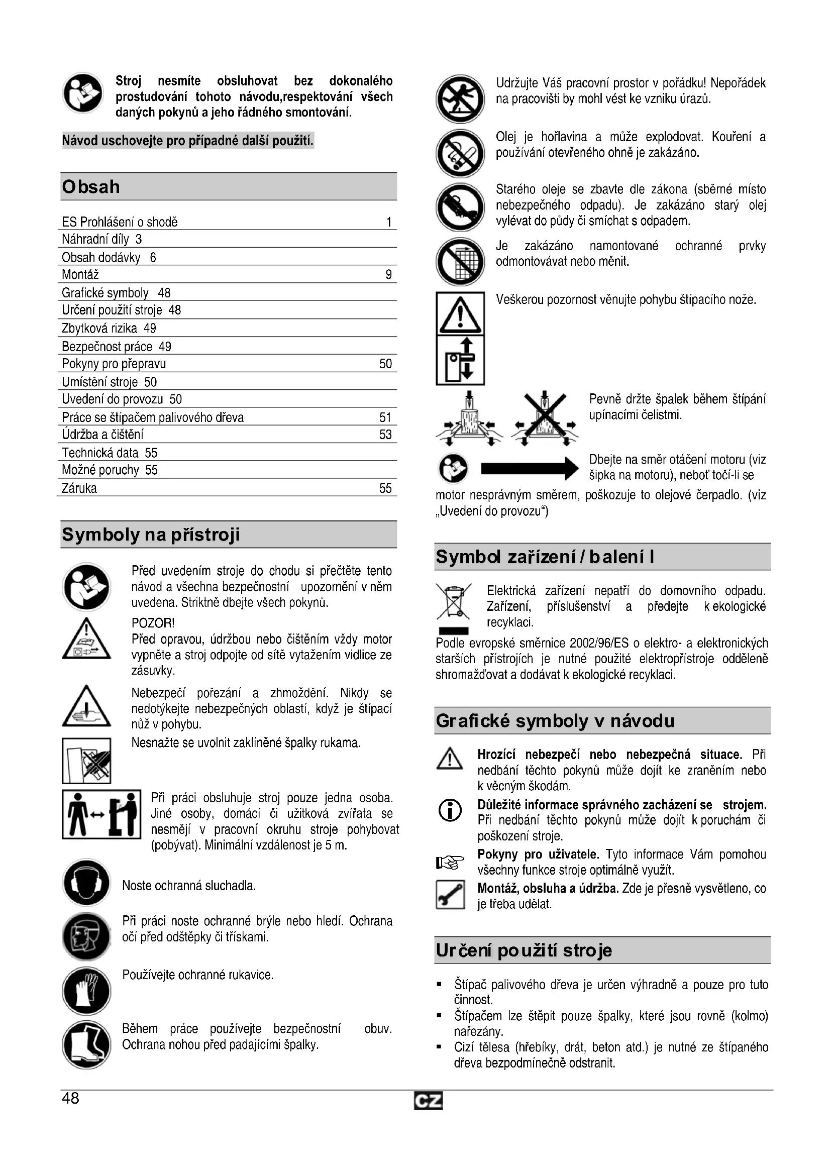 ES Prohlášení o shodě 1 Náhradní díly 3 Obsah dodávky 6 Montáž 9 Grafické symboly 48 Určení použití stroje 48 Zbytková rizika 49 Bezpečnost práce 49 Pokyny pro přepravu 50 Umístění stroje 50 Uvedení do provozu 50 Práce se štípačem palivového dřeva 51 Údržba a čištění 53 Technická data 55 Možné poruchy 55 Záruka 55