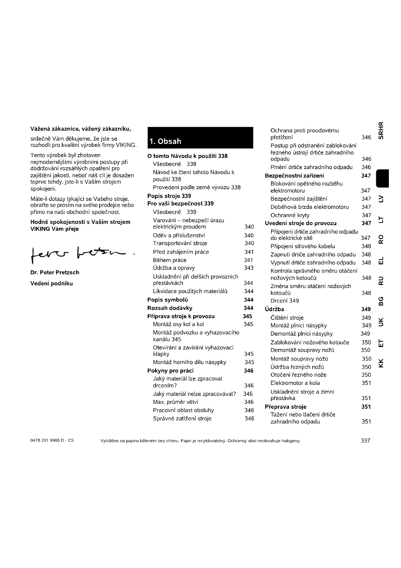 SRHRCS 0478 201 9906 D - CS LVLTROELRUBGUKETKK Vážená zákaznice, vážený zákazníku, srdečně Vám děkujeme, že jste se rozhodli pro kvalitní výrobek firmy VIKING. Tento výrobek byl zhotoven nejmodernějšími výrobními postupy při dodržování rozsáhlých opatření pro zajištění jakosti, neboť náš cíl je dosažen teprve tehdy, jste-li s Vaším strojem spokojeni. Máte-li dotazy týkající se Vašeho stroje, obraťte se prosím na svého prodejce nebo přímo na naši obchodní společnost. Hodně spokojenosti s Vaším strojem VIKING Vám přeje Vedení podniku Vytištěno na papíru běleném bez chloru. Papír je recyklovatelný. Ochranný obal neobsahuje halogeny.