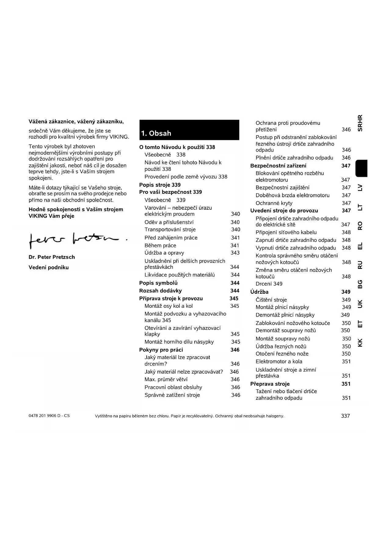 SRHRCS 0478 201 9906 D - CS LVLTROELRUBGUKETKK Vážená zákaznice, vážený zákazníku, srdečně Vám děkujeme, že jste se rozhodli pro kvalitní výrobek firmy VIKING. Tento výrobek byl zhotoven nejmodernějšími výrobními postupy při dodržování rozsáhlých opatření pro zajištění jakosti, neboť náš cíl je dosažen teprve tehdy, jste-li s Vaším strojem spokojeni. Máte-li dotazy týkající se Vašeho stroje, obraťte se prosím na svého prodejce nebo přímo na naši obchodní společnost. Hodně spokojenosti s Vaším strojem VIKING Vám přeje Vedení podniku Vytištěno na papíru běleném bez chloru. Papír je recyklovatelný. Ochranný obal neobsahuje halogeny.