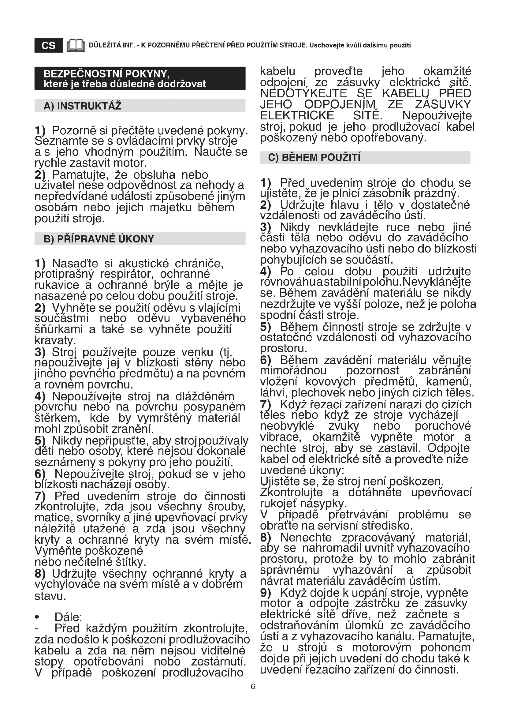 DŮLEŽITÁ INF. - K POZORNÉMU PŘEČTENÍ PŘED POUŽITÍM STROJE. Uschovejte kvůli dalšímu použití BEZPEČNOSTNÍ POKYNY, které je třeba důsledně dodržovat A) INSTRUKTÁŽ