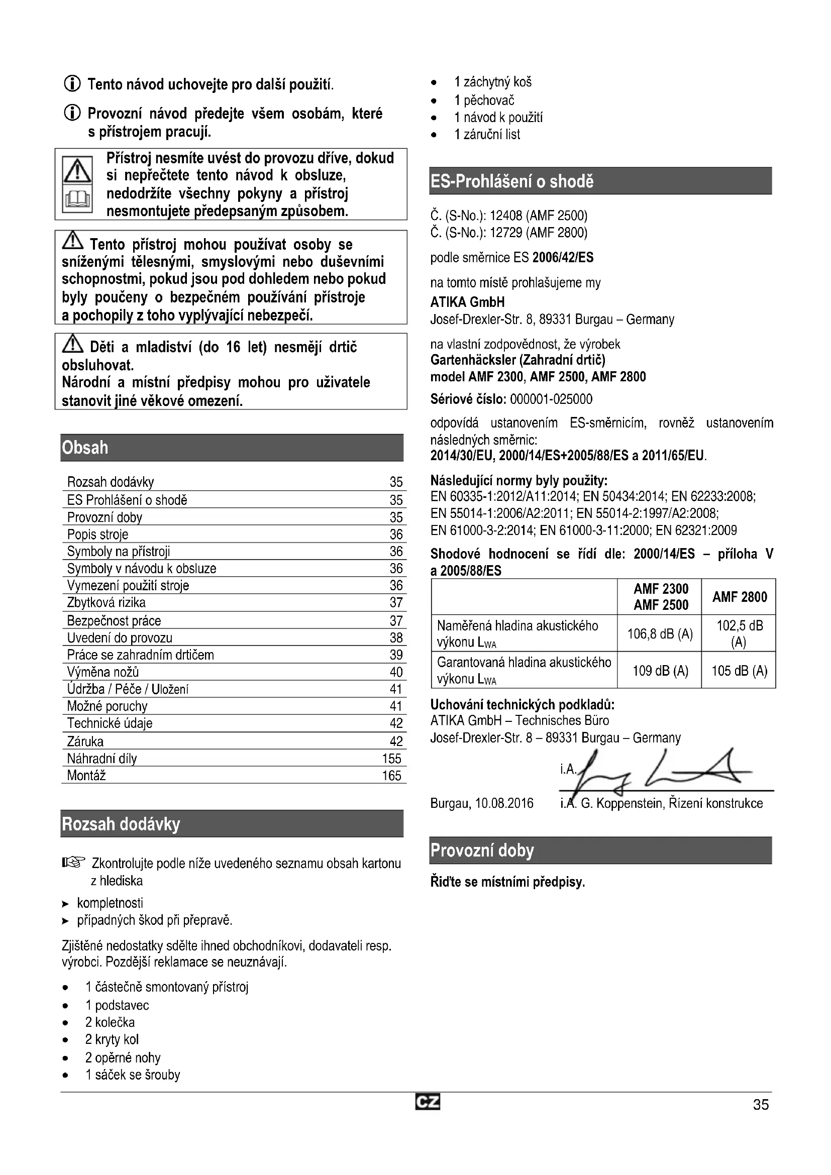 ES-Prohlášení o shodě Č. (S-No.): 12408 (AMF 2500) Č. (S-No.): 12729 (AMF 2800) podle směrnice ES 2006/42/ES na tomto místě prohlašujeme my ATIKA GmbH Josef-Drexler-Str. 8, 89331 Burgau – Germany na vlastní zodpovědnost, že výrobek Gartenhäcksler (Zahradní drtič) model AMF 2300, AMF 2500, AMF 2800 Sériové číslo: 000001-025000 odpovídá ustanovením ES-směrnicím, rovněž ustanovením následných směrnic: 2014/30/EU, 2000/14/ES+2005/88/ES a 2011/65/EU. Následující normy byly použity: EN 60335-1:2012/A11:2014; EN 50434:2014; EN 62233:2008; EN 55014-1:2006/A2:2011; EN 55014-2:1997/A2:2008; EN 61000-3-2:2014; EN 61000-3-11:2000; EN 62321:2009 Shodové hodnocení se řídí dle: 2000/14/ES – příloha V a 2005/88/ES