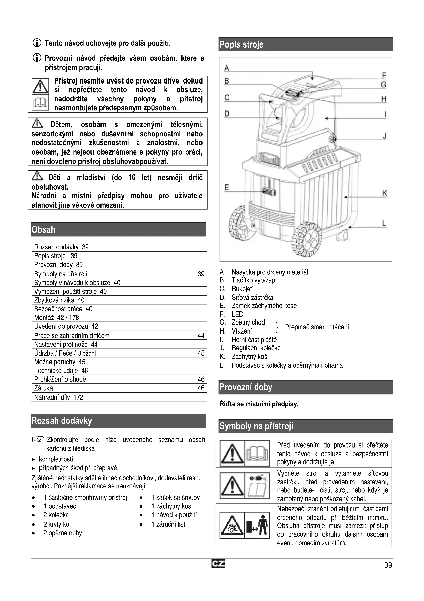 Obsah Rozsah dodávky 39 Popis stroje 39 Provozní doby 39 Symboly na přístroji 39 Symboly v návodu k obsluze 40 Vymezení použití stroje 40 Zbytková rizika 40 Bezpečnost práce 40 Montáž 42 / 178 Uvedení do provozu 42 Práce se zahradním drtičem 44 Nastavení protinože 44 Údržba / Péče / Uložení 45 Možné poruchy 45 Technické údaje 46 Prohlášení o shodě 46 Záruka 46 Náhradní díly 172 Rozsah dodávky Zkontrolujte podle níže uvedeného seznamu obsah kartonu z hlediska kompletnosti případných škod při přepravě. Zjištěné nedostatky sdělte ihned obchodníkovi, dodavateli resp. výrobci. Pozdější reklamace se neuznávají. 1 částečně smontovaný přístroj 1 sáček se šrouby 1 podstavec 1 záchytný koš 2 kolečka 1 návod k použití 2 kryty kol 1 záruční list 2 opěrné nohy