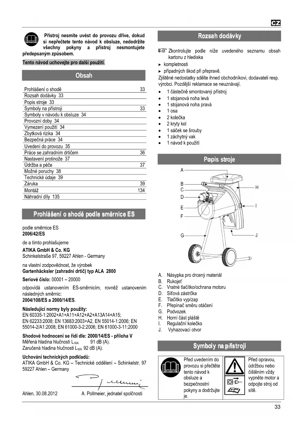 podle směrnice ES 2006/42/ES de a tímto prohlašujeme ATIKA GmbH & Co. KG Schinkelstraße 97, 59227 Ahlen - Germany na vlastní zodpovědnost, že výrobek Gartenhäcksler (zahradní drtič) typ ALA 2800 Seriové číslo: 00001 – 20000 odpovídá ustanovením ES-směrnicím, rovněž ustanovením následných směrnic: 2004/108/ES a 2000/14/ES. Následující normy byly použity: EN 60335-1:2002+A1+A11+A12+A2+A13A14+A15; EN 62233:2008; EN 13683:2003+A2, EN 55014-1:2006; EN 55014-2/A1:2008; EN 61000-3-2:2006; EN 61000-3-11:2000 Shodové hodnocení se řídí dle: 2000/14/ES - příloha V Měřená hladina hlučnosti L