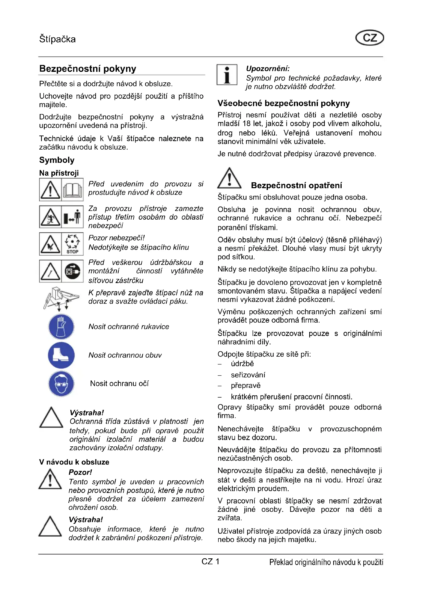Výstraha! Ochranná třída zůstává v platnosti jen tehdy, pokud bude při opravě použit originální izolační materiál a budou zachovány izolační odstupy. V návodu k obsluze Pozor! Tento symbol je uveden u pracovních nebo provozních postupů, které je nutno přesně dodržet za účelem zamezení ohrožení osob. Výstraha! Obsahuje informace, které je nutno dodržet k zabránění poškození přístroje. Upozornění: Symbol pro technické požadavky, které je nutno obzvláště dodržet. Všeobecné bezpečnostní pokyny Přístroj nesmí používat děti a nezletilé osoby mladší 18 let, jakož i osoby pod vlivem alkoholu, drog nebo léků. Veřejná ustanovení mohou stanovit minimální věk uživatele. Je nutné dodržovat předpisy úrazové prevence. Bezpečnostní opatření Štípačku smí obsluhovat pouze jedna osoba. Obsluha je povinna nosit ochrannou obuv, ochranné rukavice a ochranu očí. Nebezpečí poranění třískami. Oděv obsluhy musí být účelový (těsně přiléhavý) a nesmí překážet. Dlouhé vlasy musí být ukryty pod síťkou. Nikdy se nedotýkejte štípacího klínu za pohybu. Štípačku je dovoleno provozovat jen v kompletně smontovaném stavu. Štípačka a napájecí vedení nesmí vykazovat žádné poškození. Výměnu poškozených ochranných zařízení smí provádět pouze odborná firma. Štípačku lze provozovat pouze s originálními náhradními díly. Odpojte štípačku ze sítě při: − údržbě − seřizování − přepravě − krátkém přerušení pracovní činnosti. Opravy štípačky smí provádět pouze odborná firma. Nenechávejte štípačku v provozuschopném stavu bez dozoru. Neuvádějte štípačku do provozu za přítomnosti nezúčastně ných osob. Neprovozujte ští pačku za deště, nenechávejte ji stát v dešti a nestříkejte na ni vodu. Hrozí úraz elektrickým proudem. V pracovní oblasti štípačky se nesmí zdržovat žádné jiné osoby. Dávejte pozor na děti a zvířata. Uživatel přístroje zodpovídá za úrazy jiných osob nebo škody na jejich majetku. Překlad originálního návodu k použitíŠtípačka CZ 2 Odstraňte z pracovní oblasti kousky dřeva a jiné předměty – hrozí zakopnutí. Bezpečnostní zařízení Motorový jistič Při přetížení štípačky odstaví motorový jistič motor. Funkce motorového jističe musí zůstat v provozu. Po vypnutí štípačky motorovým jističem postupujte následovně: