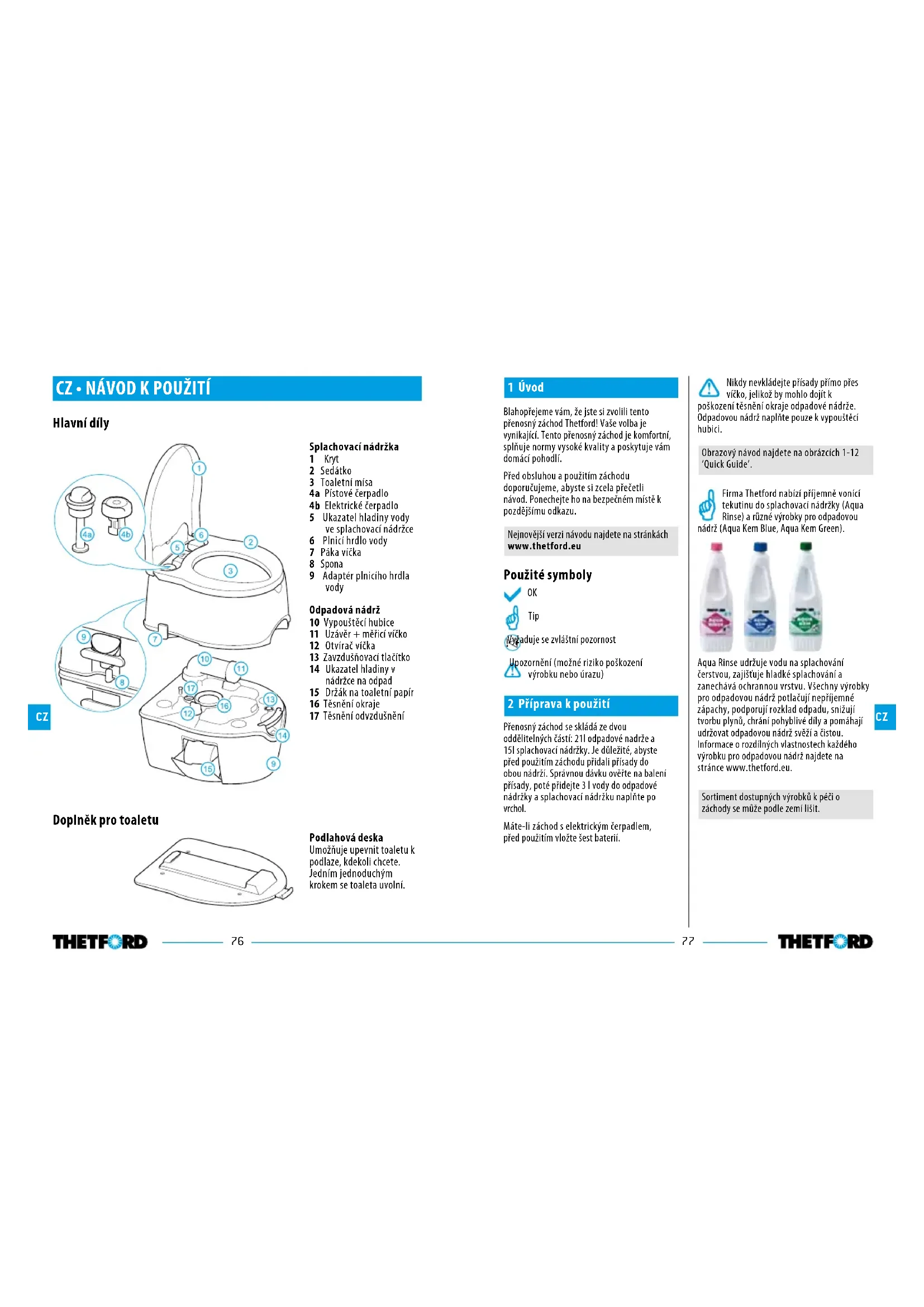 Splachovací nádržka 1 Kryt 2 Sedátko 3 Toaletní mísa 4a Pístové čerpadlo 4b Elektrické čerpadlo 5 Ukazatel hladiny vody ve splachovací nádržce 6 Plnicí hrdlo vody 7 Páka víčka 8 Spona 9 Adaptér plnicího hrdla vody Odpadová nádrž 10 Vypouštěcí hubice 11 Uzávěr + měřicí víčko 12 Otvírač víčka 13 Zavzdušňovací tlačítko 14 Ukazatel hladiny v nádržce na odpad 15 Držák na toaletní papír 16 Těsnění okraje 17 Těsnění odvzdušnění Podlahová deska Umožňuje upevnit toaletu k podlaze, kdekoli chcete. Jedním jednoduchým krokem se toaleta uvolní. Doplněk pro toaletu Hlavní díly7978 5 Čištění Stejně jako záchod doma je také důležité pravidelně čistit přenosný záchod. Předejdete tím usazeninám vápníku a zajistíte optimální hygienu. Vnitřek mísy čistěte čisticím prostředkem na záchodové mísy a na vnější část záchodu používejte koupelnový čisticí prostředek. K čištění přenosného záchodu nepoužívejte čisticí prostředky pro domácnost. Mohou způsobit trvalé poškození těsnění a jiných dílů záchodu. 6 Provoz v zimě Za chladného počasí můžete záchod normálně používat za předpokladu, že je záchod na vyhřívaném místě. Pokud není a je riziko mrazu, doporučujeme, abyste zcela vyprázdnili odpadovou nádrž i splachovací nádržku. 7 Údržba K prodloužení životnosti záchodu doporučujeme jeho pravidelnou údržbu. K mazání těsnění nikdy nepoužívejte vazelínu ani rostlinný olej, jelikož by to mohlo způsobit netěsnosti odpadové nádrže. 8 Skladování Pokud očekáváte, že záchod nebude na delší období používán, celý záchod musíte důkladně vyprázdnit, vyčistit a vysušit. Toto je také vhodná doba k provedení údržby. Během skladování doporučujeme ponechat víčko otevřené, aby se předešlo jeho poškození a uvolnit víčko plnění vody, aby se splachovací nádržka odvětrávala. Máte-li elektrické čerpadlo, vyjměte baterie. 9 Zneškodnění Tento produkt byl navržen a vyroben z vysoce kvalitních materiálů a součástek, které lze recyklovat a znovu použít. Když Váš záchod dosáhne konce životnosti, zneškodněte ho v souladu s místními zákony. Nevyhazujte tento záchod jako běžný domácí odpad. Správné zneškodnění Vašeho starého zařízení pomůže předejít možným negativním dopadům na životní prostředí a lidské zdraví. 10 Máte dotazy? Požadujete-li další informace o záchodu, navštivte naši webovou stránku: www.thetford.eu. S případnými dalšími dotazy se laskavě obraťte na oddělení služeb zákazníkům ve vaší zemi nebo v místě dovolené (viz adresy na zadní straně). Pro správnou a rychlou podporu laskavě zajistěte, abyste měli k dispozici všechny příslušné informace o typu výrobku (viz poslední stránka). Náhradní díly Originální náhradní díly Thetford jsou dostupné prostřednictvím vašeho prodejce nebo autorizovaného servisního střediska Thetford. Často kladené dotazy Co musím udělat, když ukazatel hladiny odpadové nádrže nepracuje? Zkontrolujte, zda je plovák v odpadové nádrži stále na místě anebo zda nečistoty nebrání činnosti. Co musím udělat, když se víčko neotevře? Po přepravě může být v nádrži nadměrný tlak. Uvolněte uzávěr vypouštěcí hubice a pomalu vytáhněte páku víčka do strany. 3 Použití záchodu Otevřete víčko Záchod lze používat s víčkem otevřeným nebo zavřeným. K otevření víčka zatáhněte za páku víčka podle níže uvedeného popisu. Po použití se vždy ujistěte, že je víčko zavřené. Spláchněte záchod Nejúčinnějšího spláchnutí dosáhnete, když ručním čerpadlem spláchnete třikrát nebo čtyřikrát. Záchod s elektrickým čerpadlem bude automaticky splachovat v krátkých intervalech. Běžný toaletní papír může způsobit ucpání. Místo běžného používejte toaletní papír Aqua Soft. Tento toaletní papír je super jemný, rychle se rozpouští, předchází ucpání a usnadňuje vyprazdňování odpadové nádrže. Záchod má místo na jednu roličku toaletního papíru, abyste měli toaletní papír vždy po ruce. 4 Vyprazdňování nádrže Odpadová nádrž Odpadovou nádrž je potřeba vyprázdnit, když ukazatel hladiny zčervená. Odpojte splachovací nádržku od odpadové nádrže. Odneste odpadovou nádrž do autorizovaného střediska pro likvidaci odpadu a vyprázdněte vypouštěcí hubicí. Abyste vyprázdnili nádrž bez rozstříknutí, stiskněte a držte zavzdušňovací tlačítko palcem, když vypouštěcí hubice směřuje dolů. Obrazový návod najdete na obrázcích 13-16 ‘Quick Guide’. Chcete-li záchod nadále používat po vyprázdnění, připravte opět odpadovou nádrž. Naše zelené výrobky Aqua Kem Green a Aqua Rinse (zkouška ISO 11734) je zcela bezpečné vyprazdňovat do a septiků nebo malých biologických systémů v kempech. Splachovací nádržka Splachovací nádržku vyprázdněte pouze, pokud neočekáváte, že nebudete záchod na delší (zimní) období používat. Nejprve vyprázdněte nádržku přes otvor pro plnění vodou, poté vyčerpejte zbytek vody z čerpadla, aby byla nádržka zcela prázdná. Vyprazdňování je povoleno pouze na autorizované skládce. Obrazový návod najdete na obrázcích 17-18 ‘Quick Guide’. CZCZ8180 11 Záruka Firma Thetford BV nabízí koncovým uživatelům jejích přenosných záchodů záruku tři roky. V případě nesprávné funkce v záruční době firma Thetford nabídne výměnu nebo opravu výrobku podle vlastního rozhodnutí. 1. K uplatnění reklamace v rámci záruky musí uživatel vzít výrobek do místa prodeje nebo autorizovaného servisního střediska Thetford Service Centre (www.thetford.eu). Reklamace zde bude posouzena.2. Díly vyměněné během opravy v záruce se stávají majetkem firmy Th